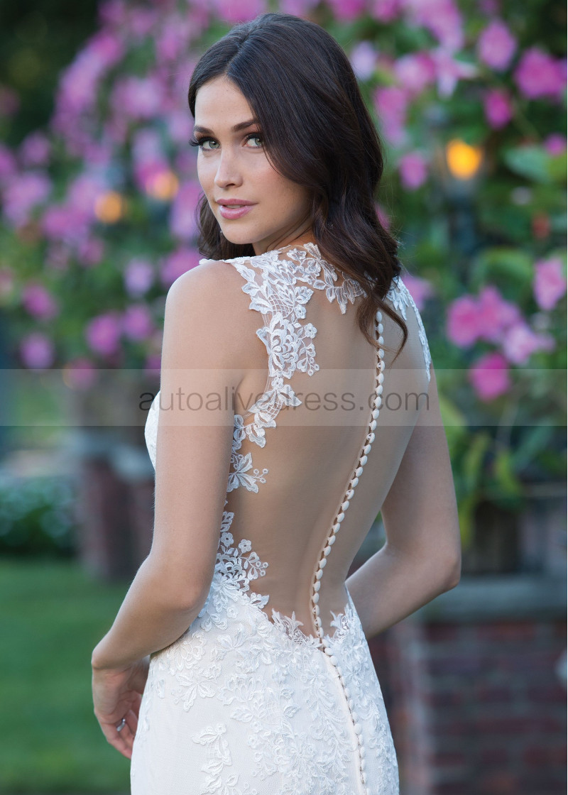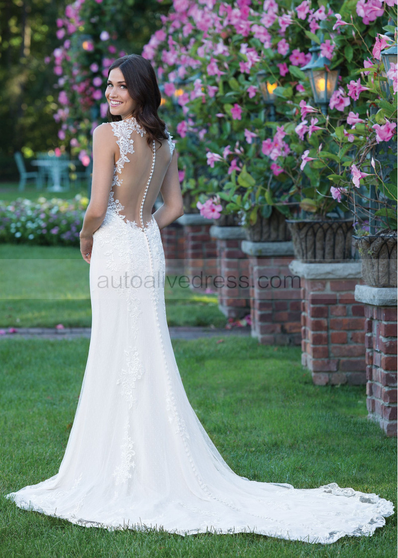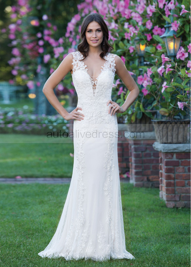 Plunging V Neck Ivory Lace Tulle Sheer Back Wedding Dress