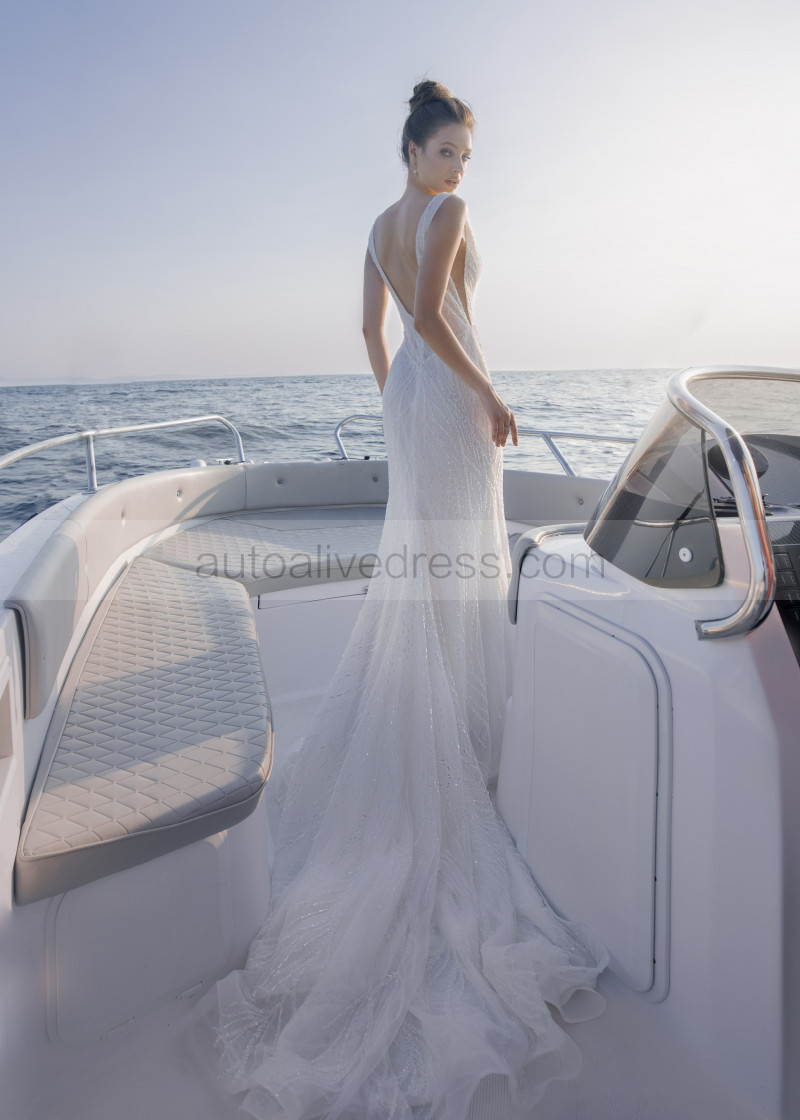 Plunging V Neck Ivory Lace Tulle Sparkly Luxurious Wedding Dress