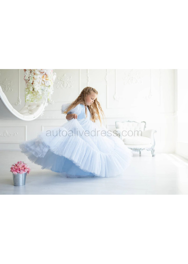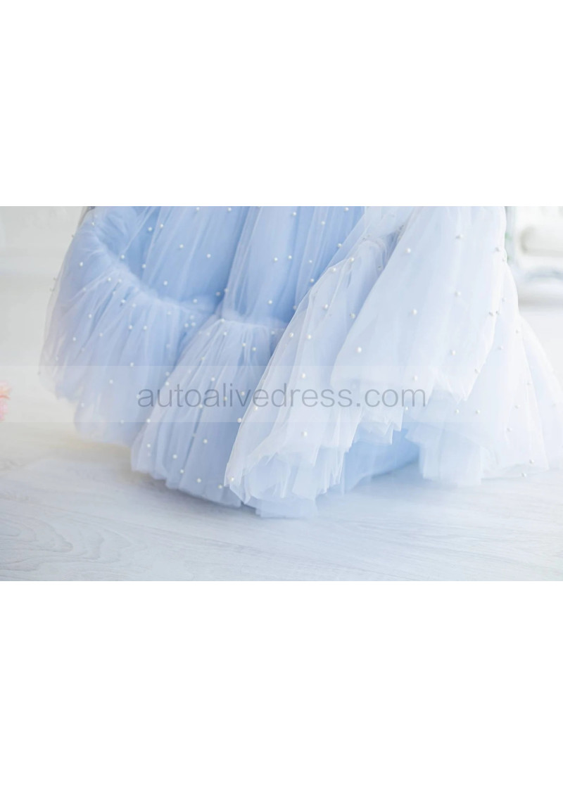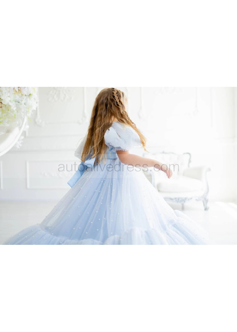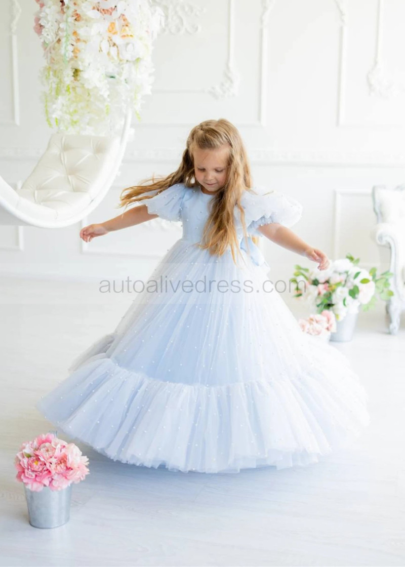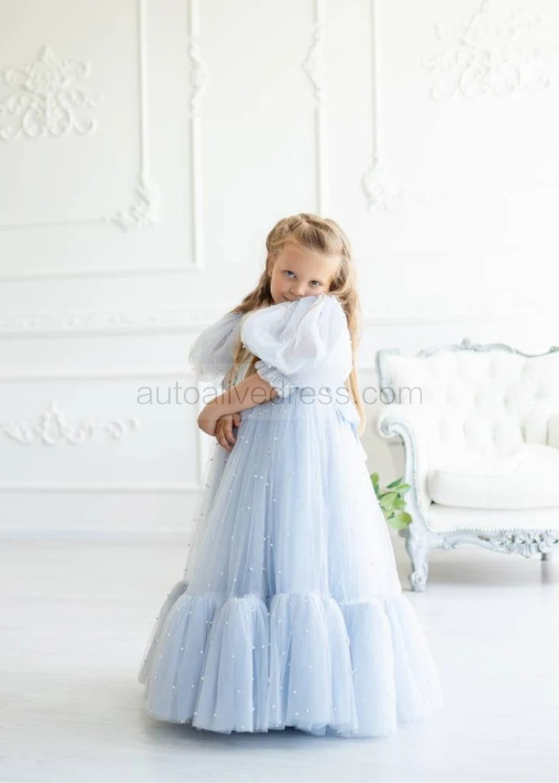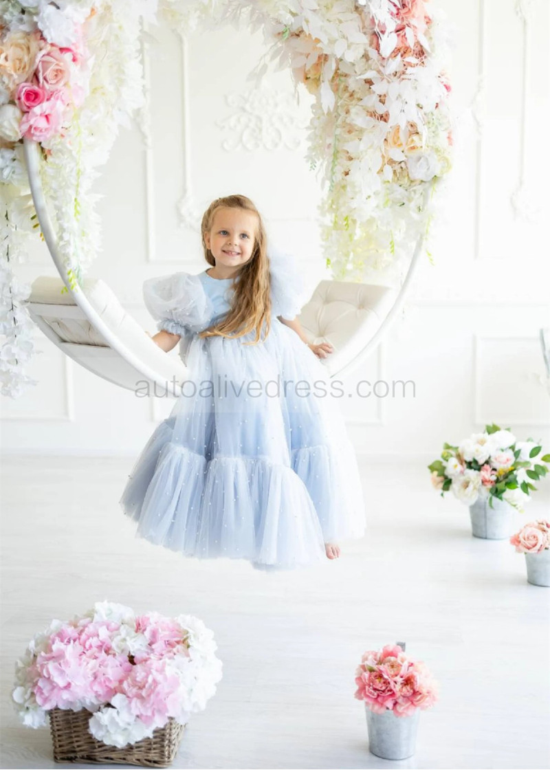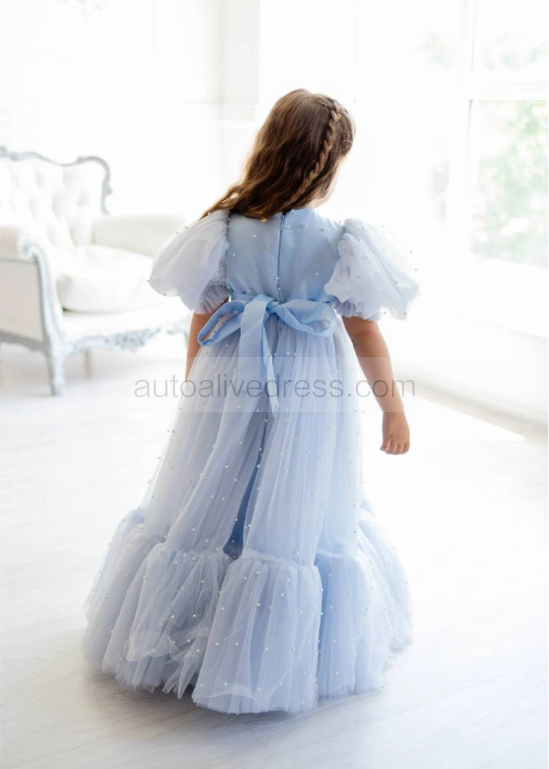Puff Sleeves Blue Tulle Pearl Flower Girl Dress
