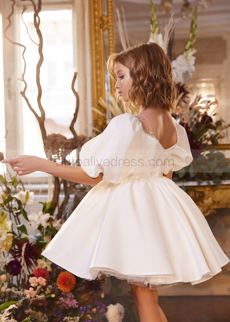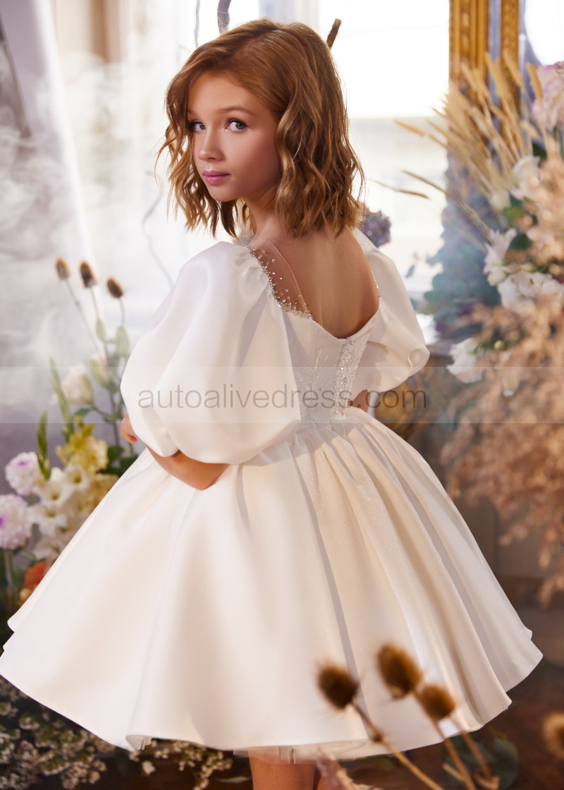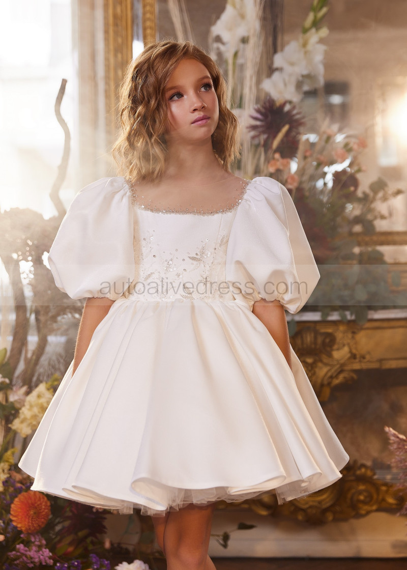 Puff Sleeves Ivory Beaded Satin Short Flower Girl Dress
