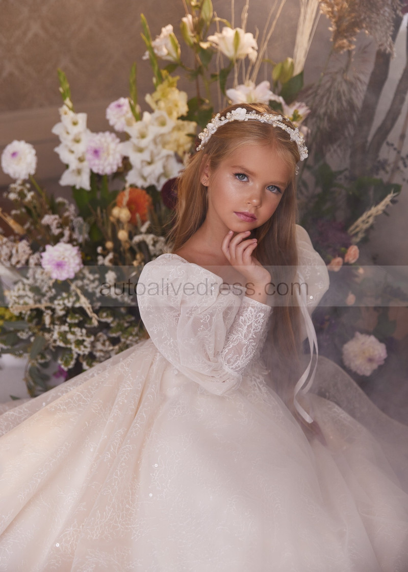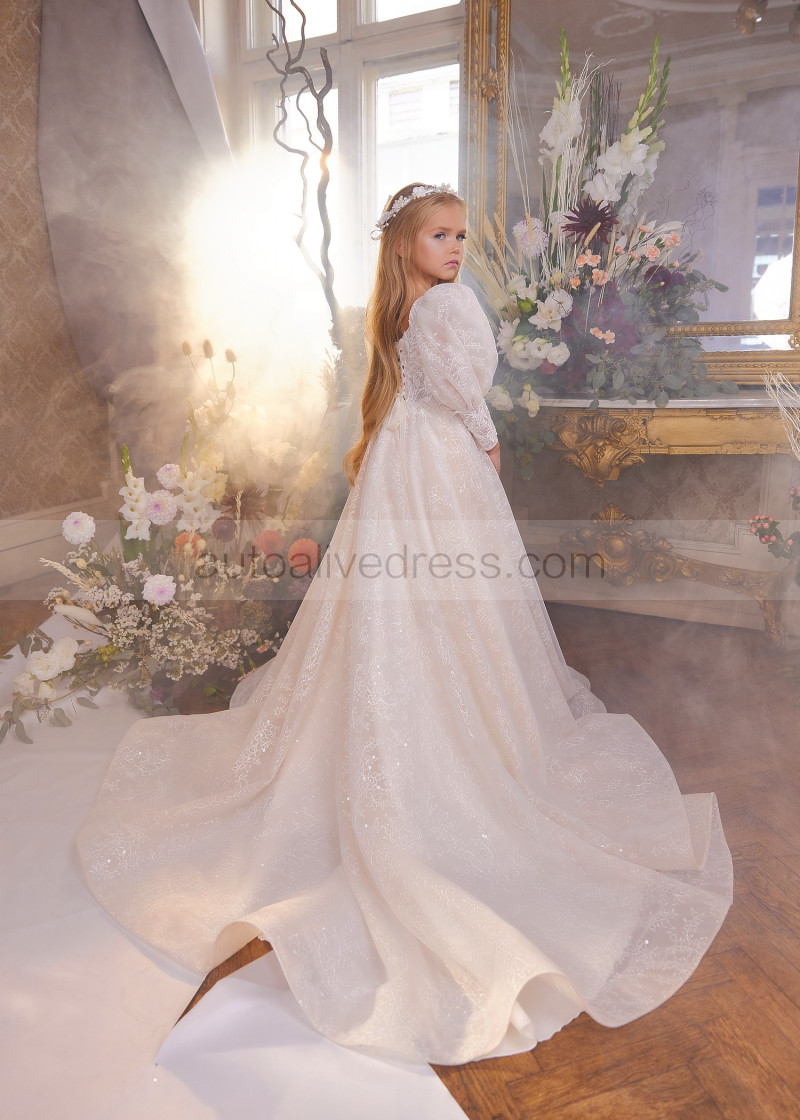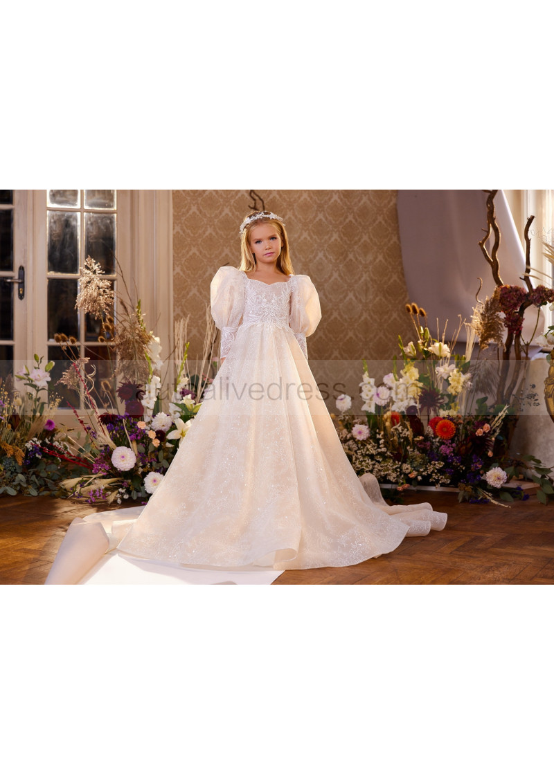 Puff Sleeves Ivory Lace Tulle Corset Back Flower Girl Dress