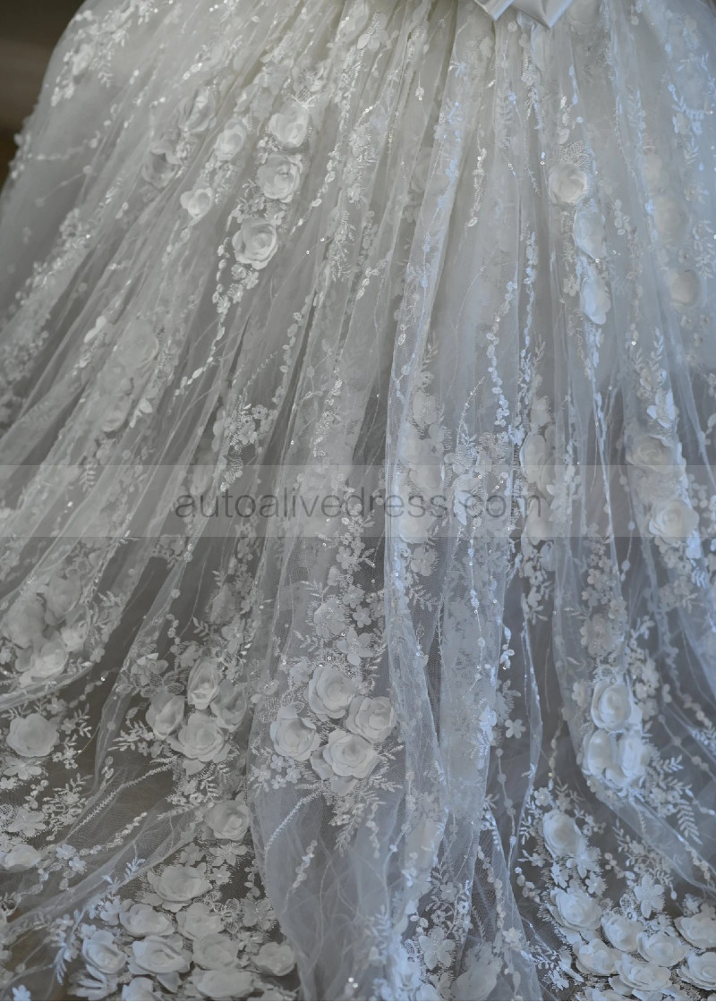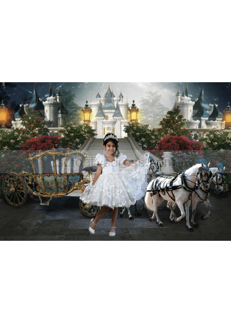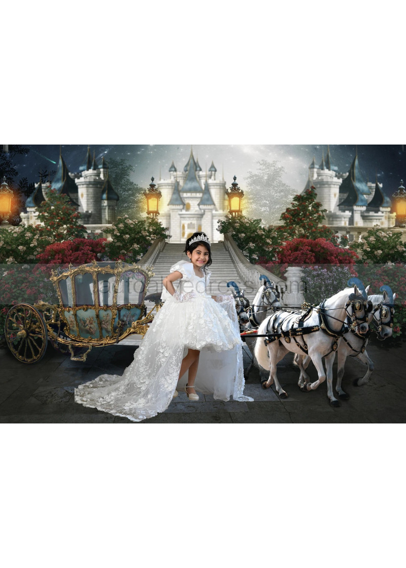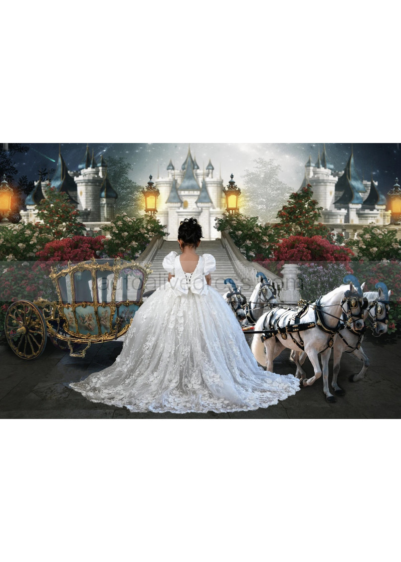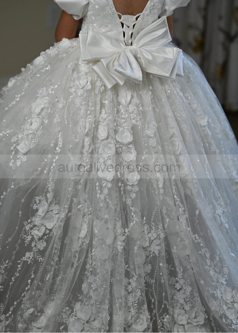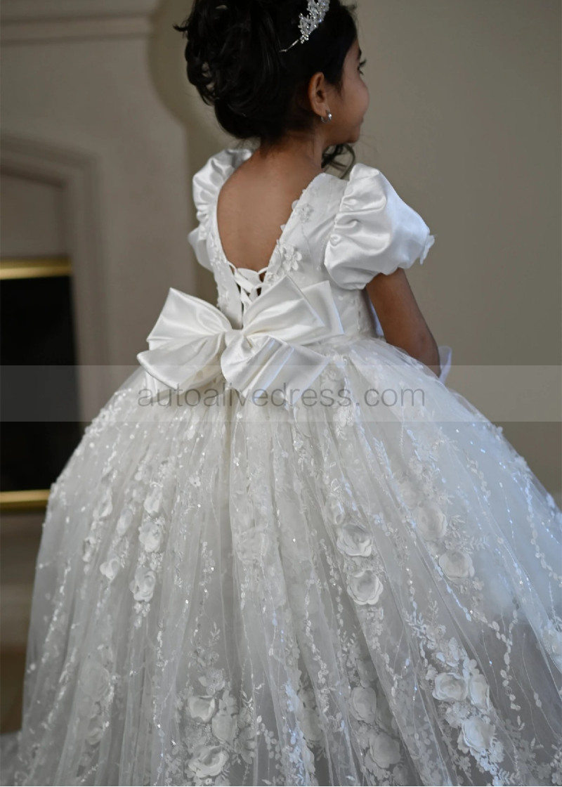 Puff Sleeves Ivory Satin Lace Floral Flower Girl Dress With Removable Train