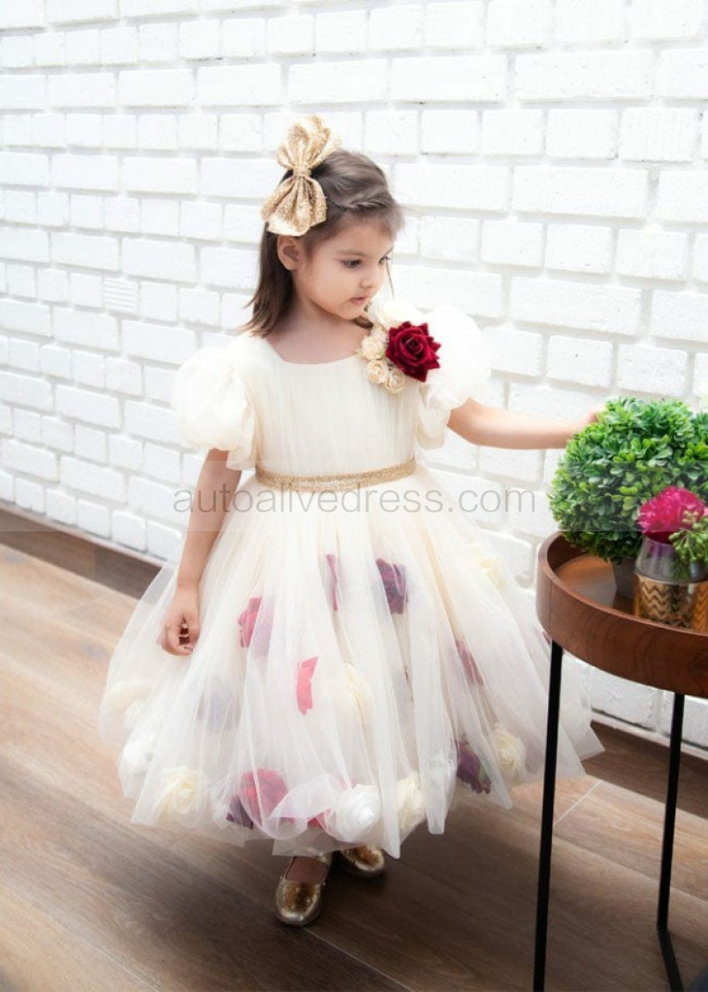 Puff Sleeves Tulle Tea Length Floral Flower Girl Dress