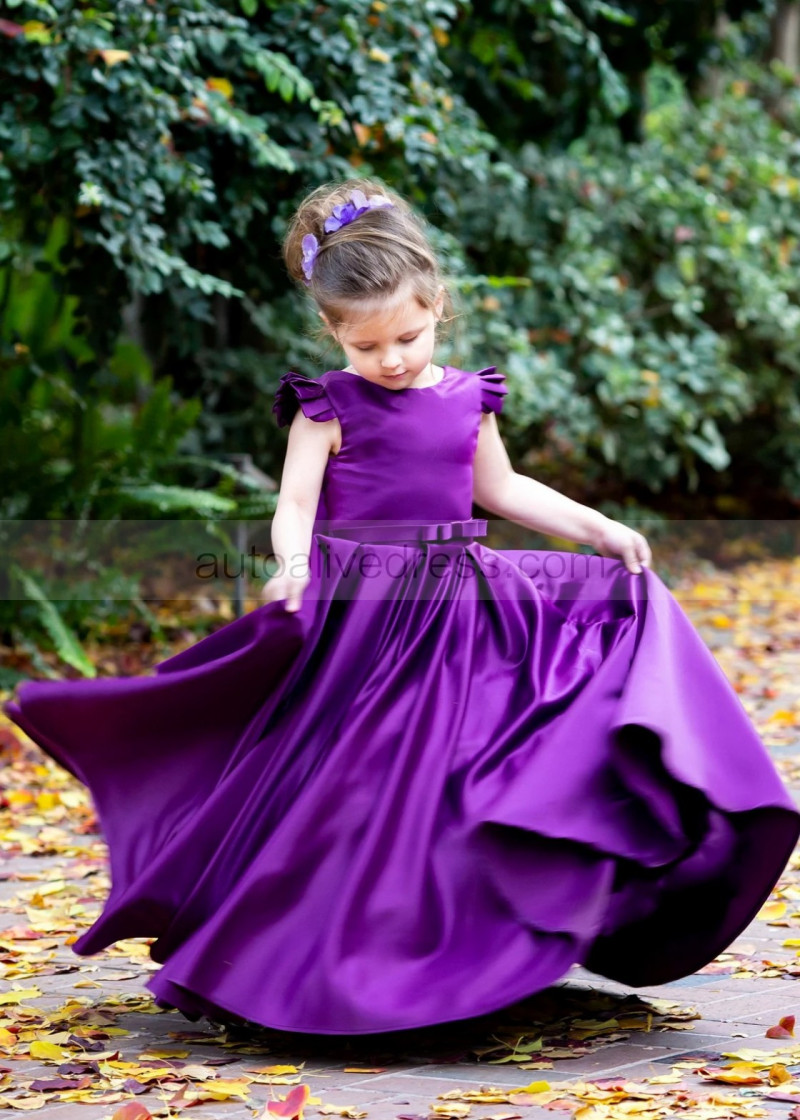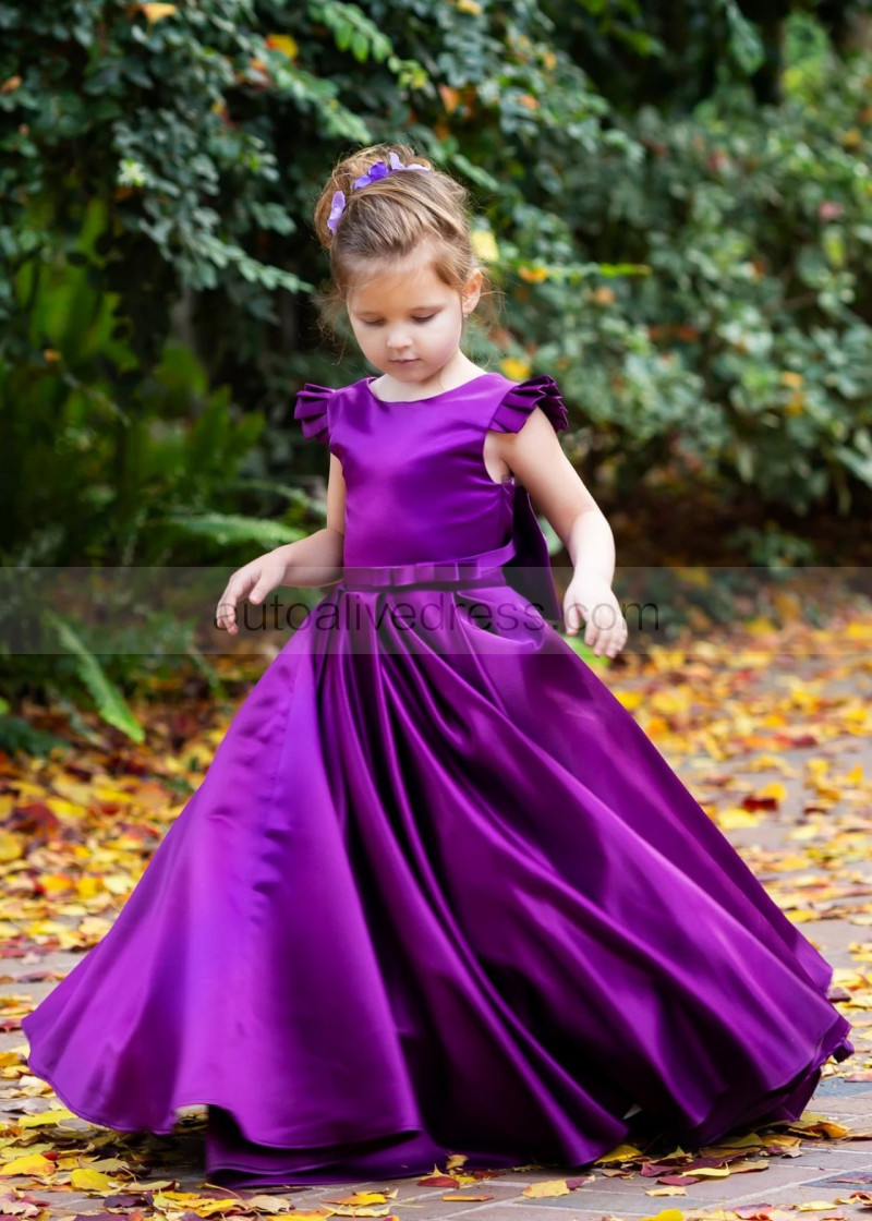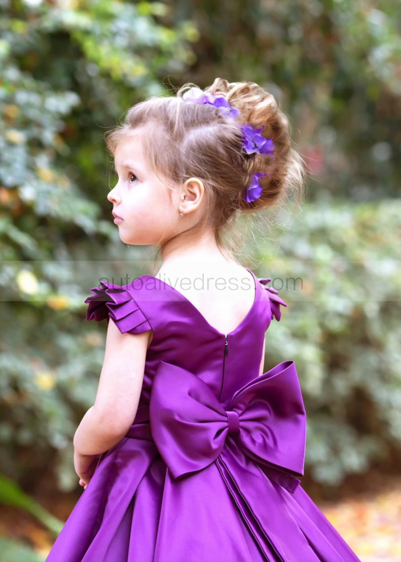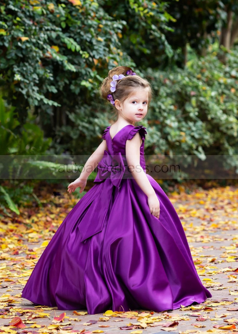 Purple Satin V Back Flower Girl Dress With Bows
