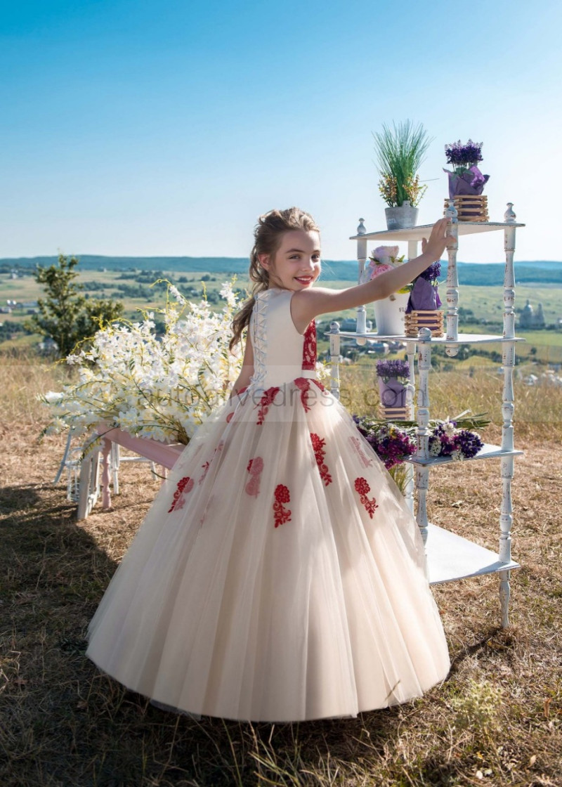 Red Lace Champagne Tulle Corset Back Gorgeous Flower Girl Dress