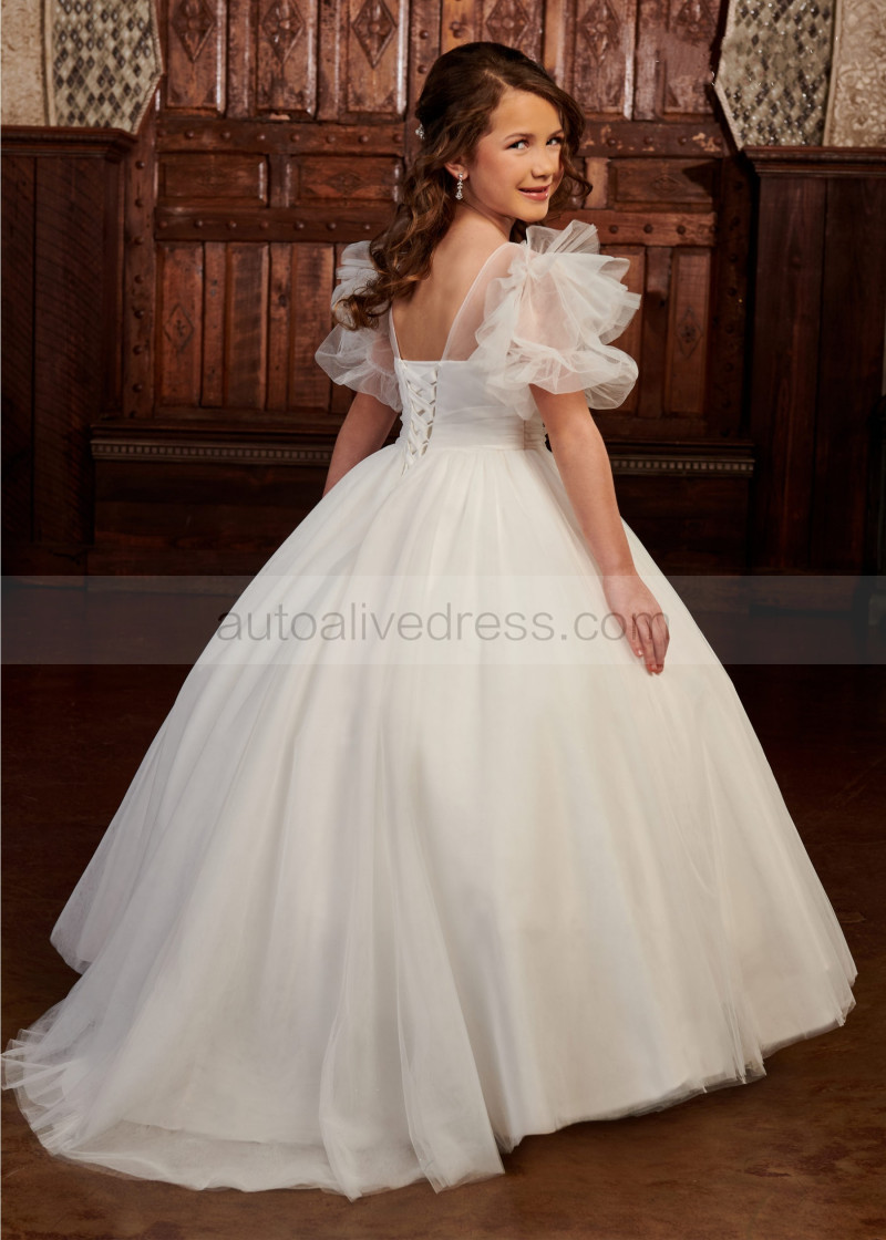 Ruffle Sleeves Ivory Tulle 3D Flowers Sweet Flower Girl Dress