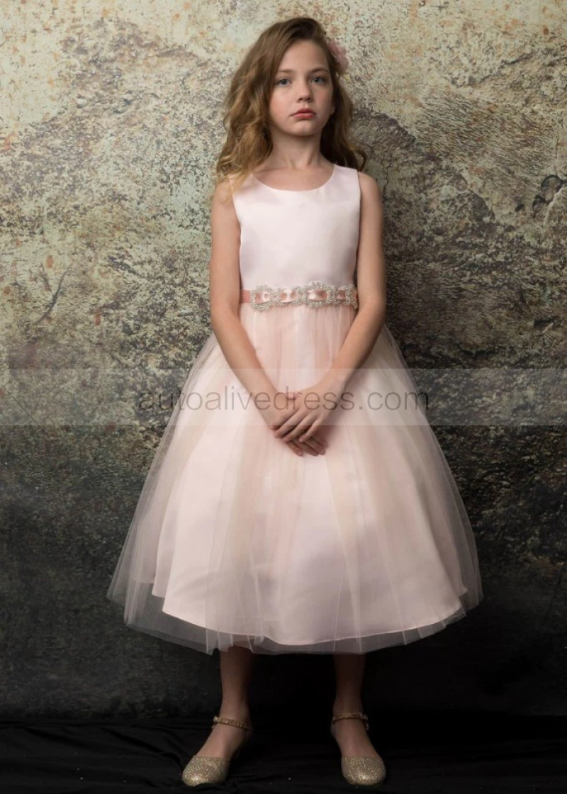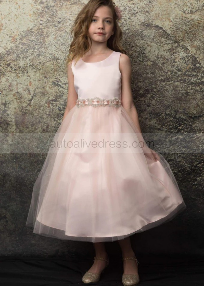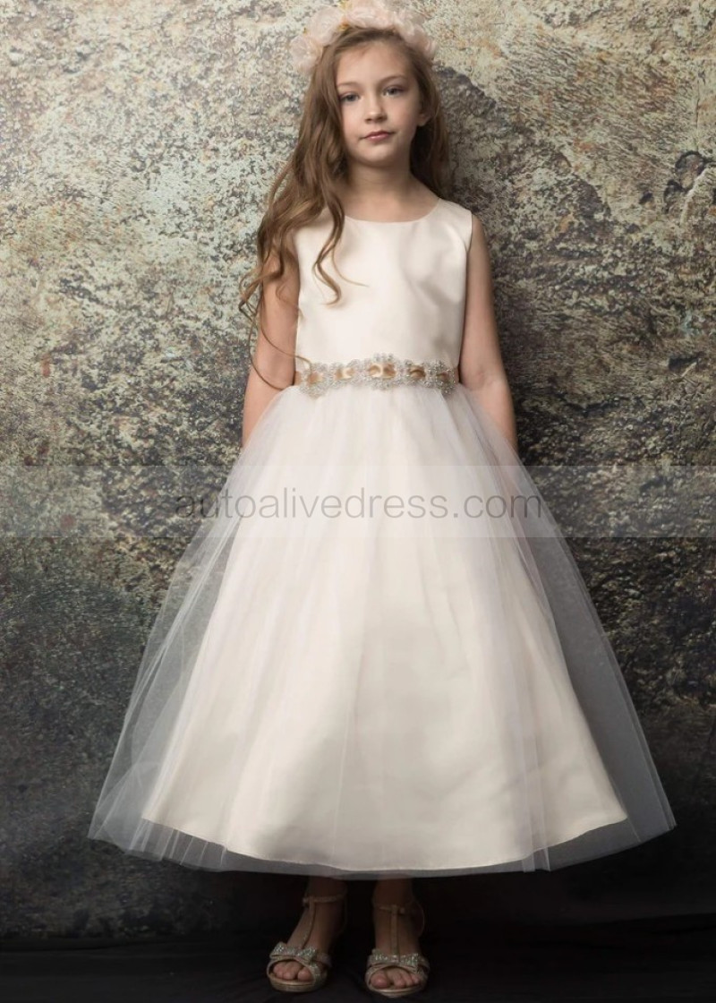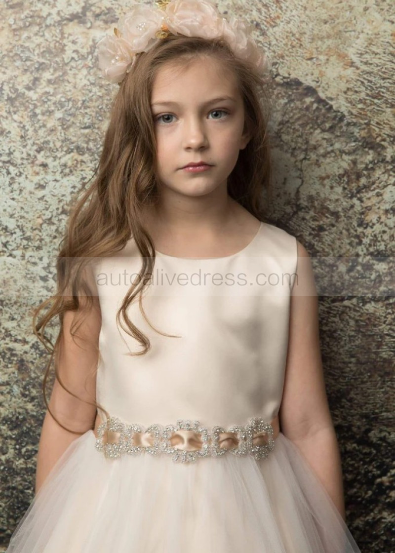 Satin Tulle Flower Girl Dress With Rhinestone Belt