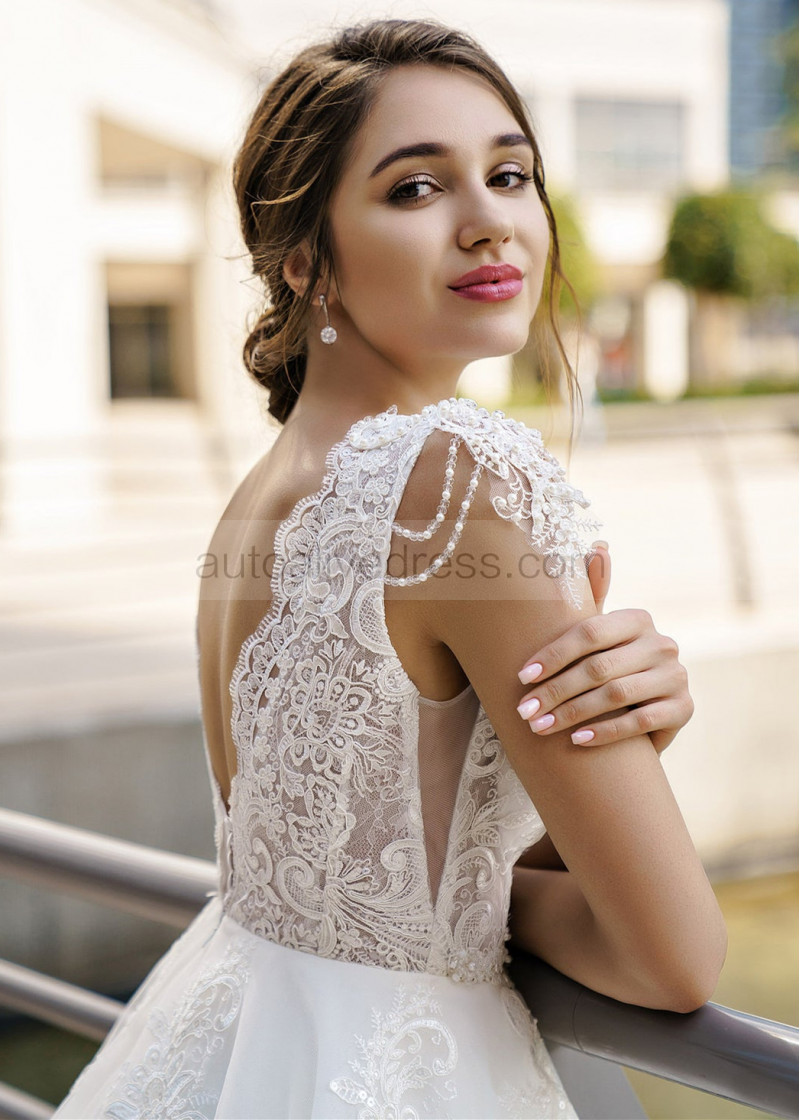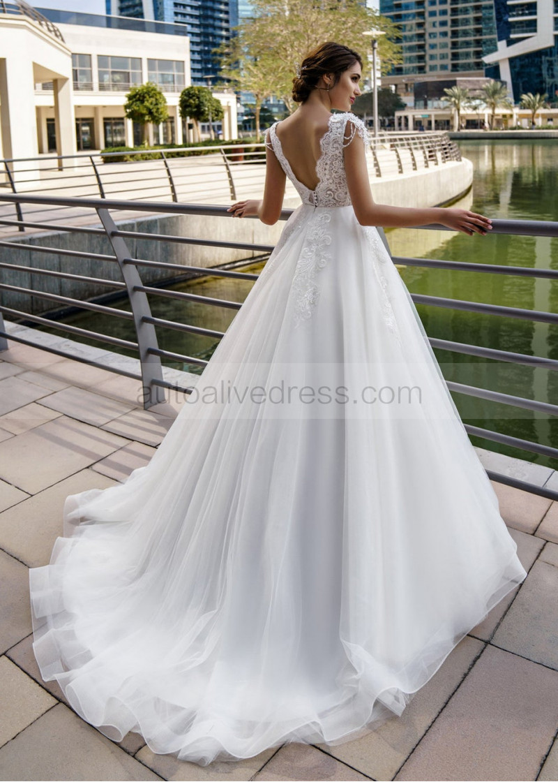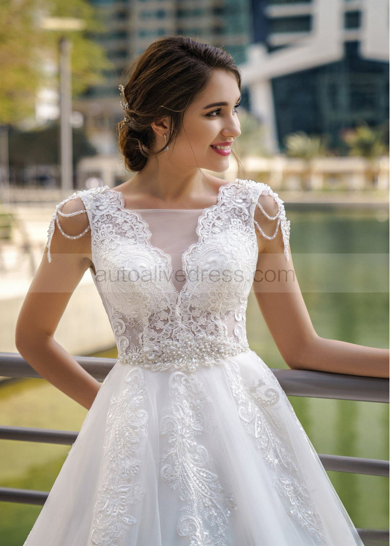 Scalloped V Neck Beaded White Lace Tulle Wedding Dress
