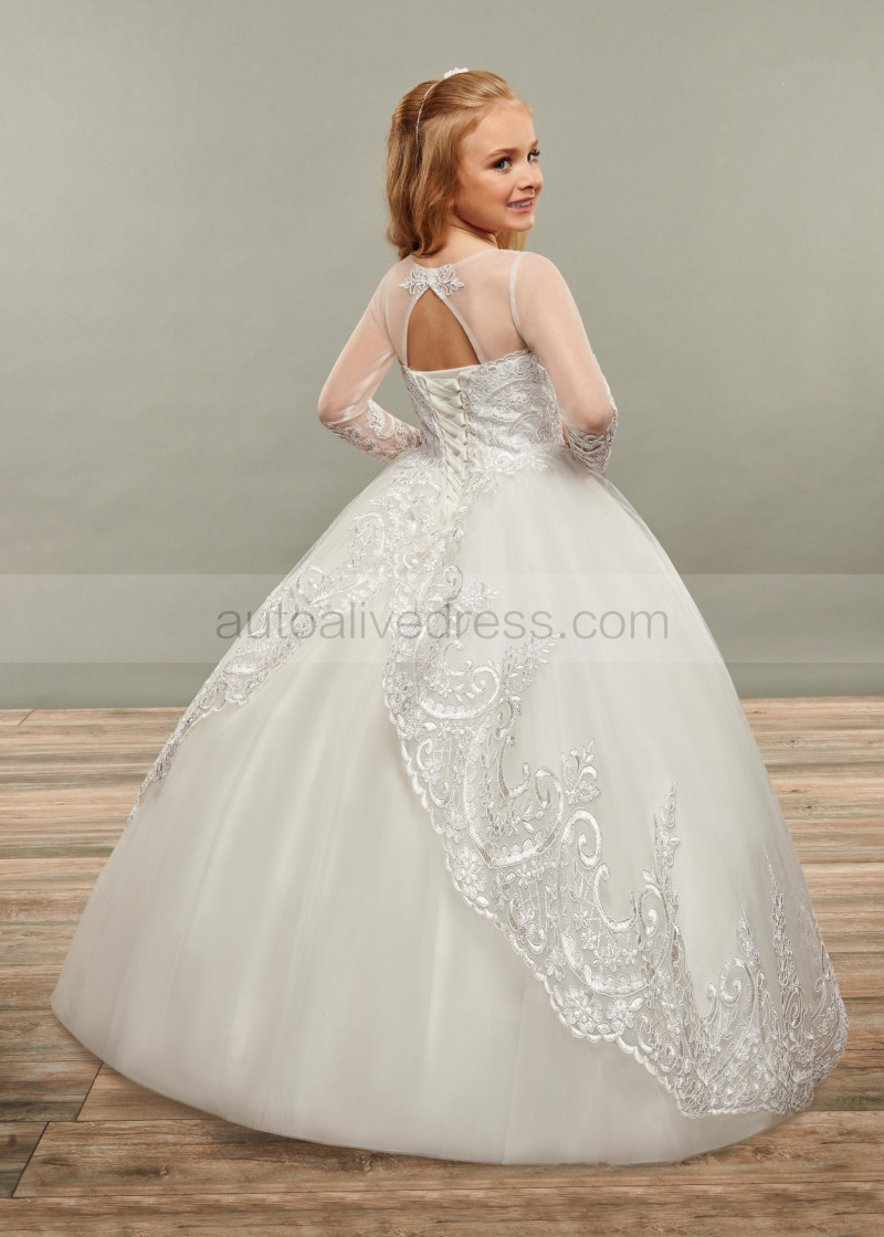Sheer Long Sleeves Ivory Lace Tulle Flower Girl Dress