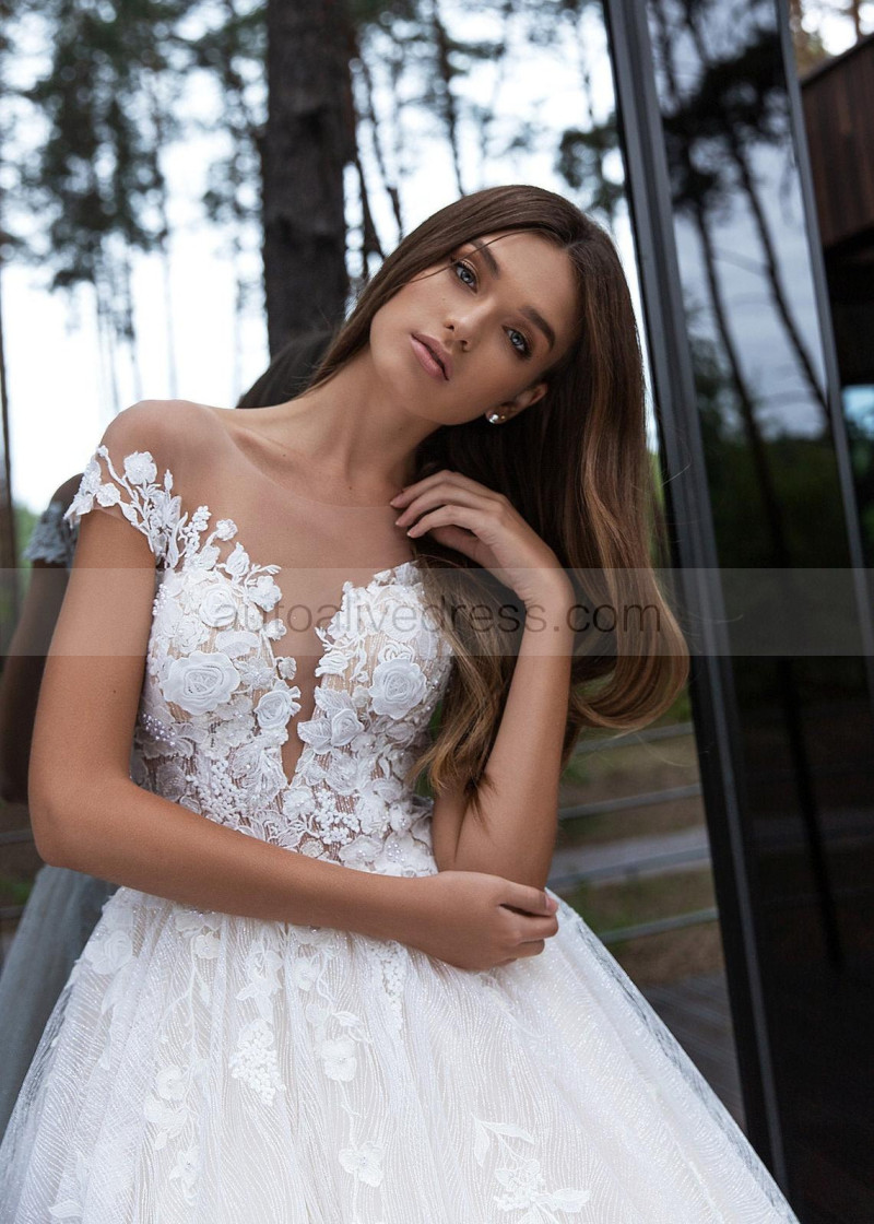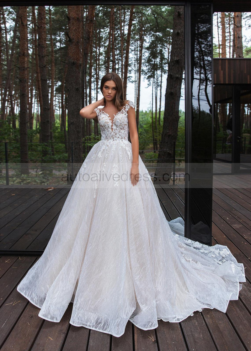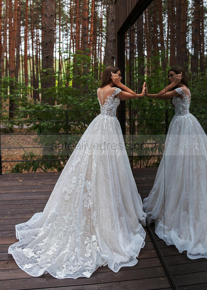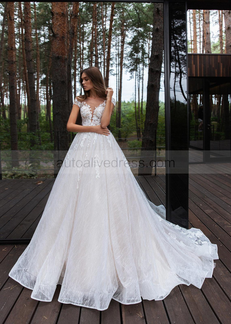 Short Sleeve Beaded Ivory Sparkling Tulle Lace Wedding Dress