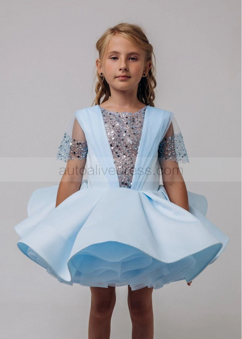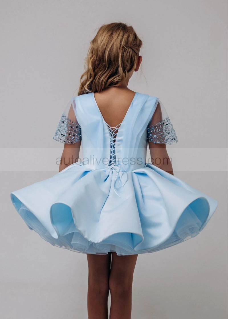 Short Sleeves Beaded Blue Satin Flower Girl Dress