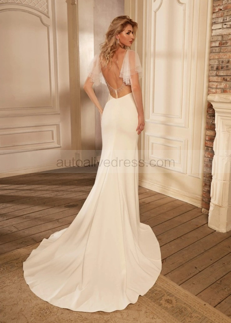 Short Sleeves Beaded Ivory Satin Tulle Wedding Dress