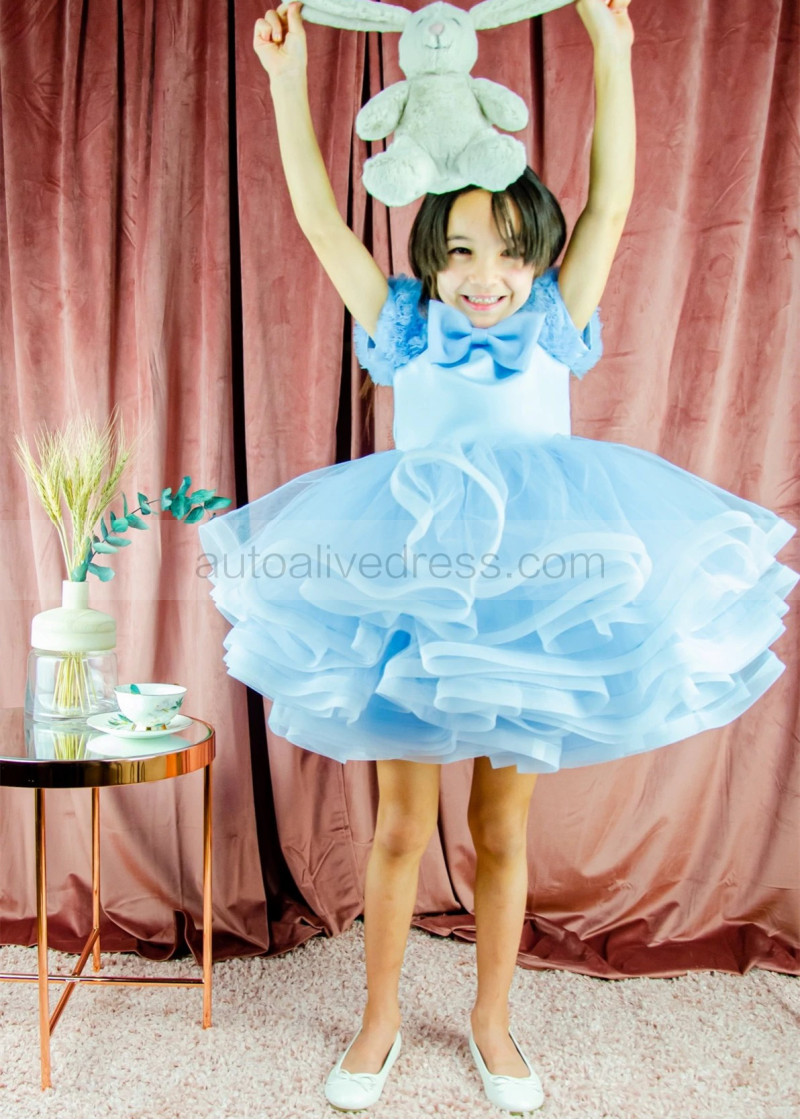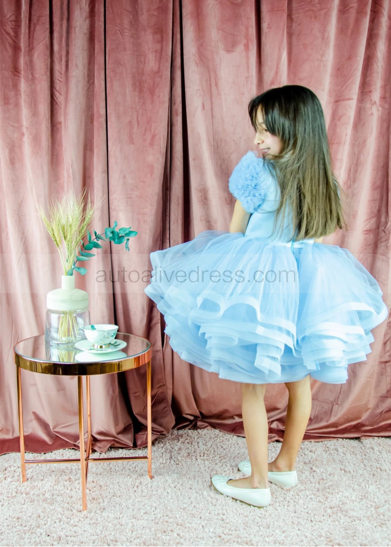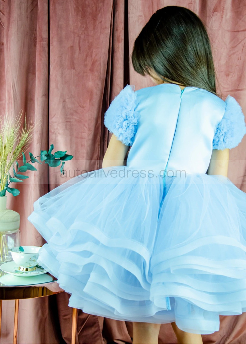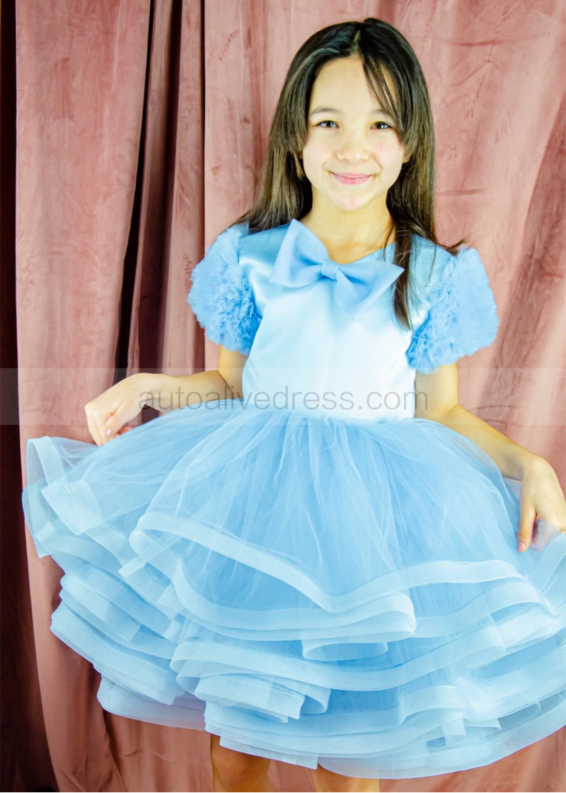 Short Sleeves Blue Satin Tulle Flower Girl Dress