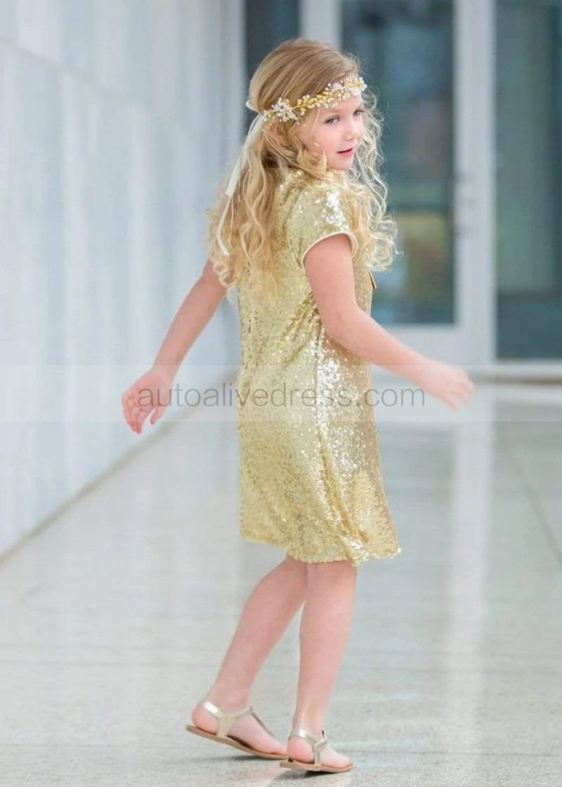 Short Sleeves Gold Sequin Knee Length Flower Girl Dress