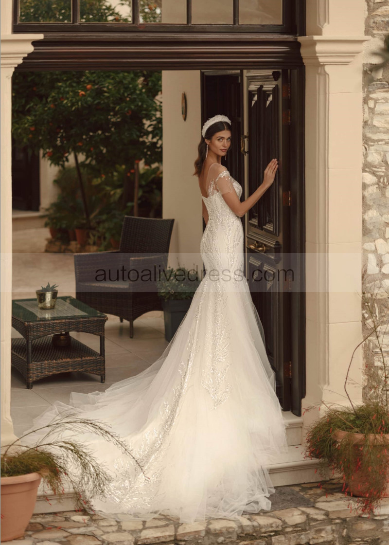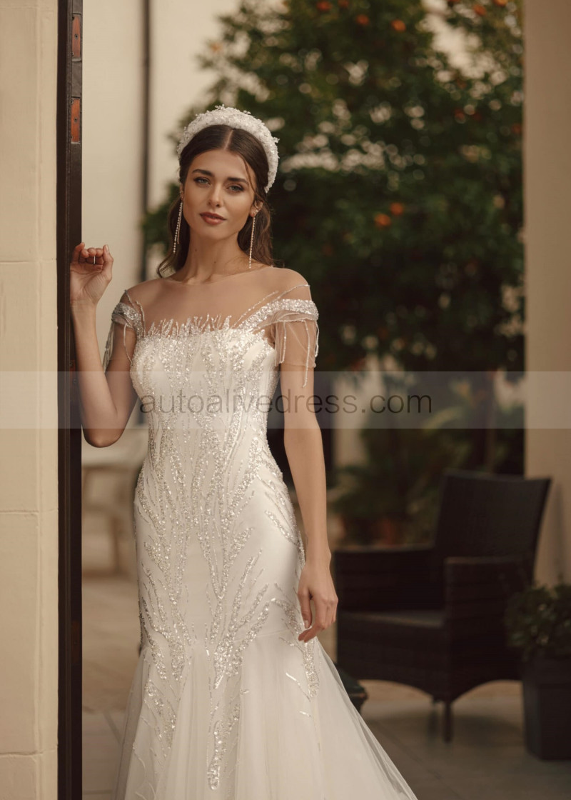 Short Sleeves Ivory Glitter Lace Tulle Anniversary Wedding Dress