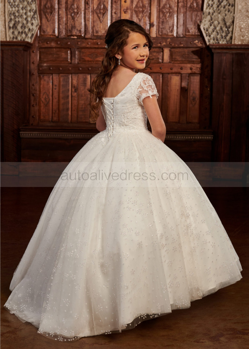 Short Sleeves Ivory Lace Glitter Tulle Latest Flower Girl Dress