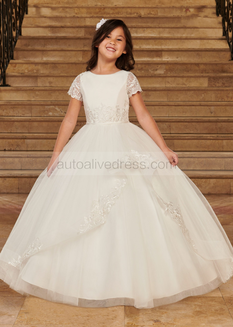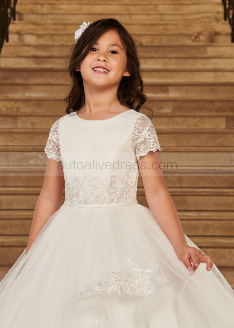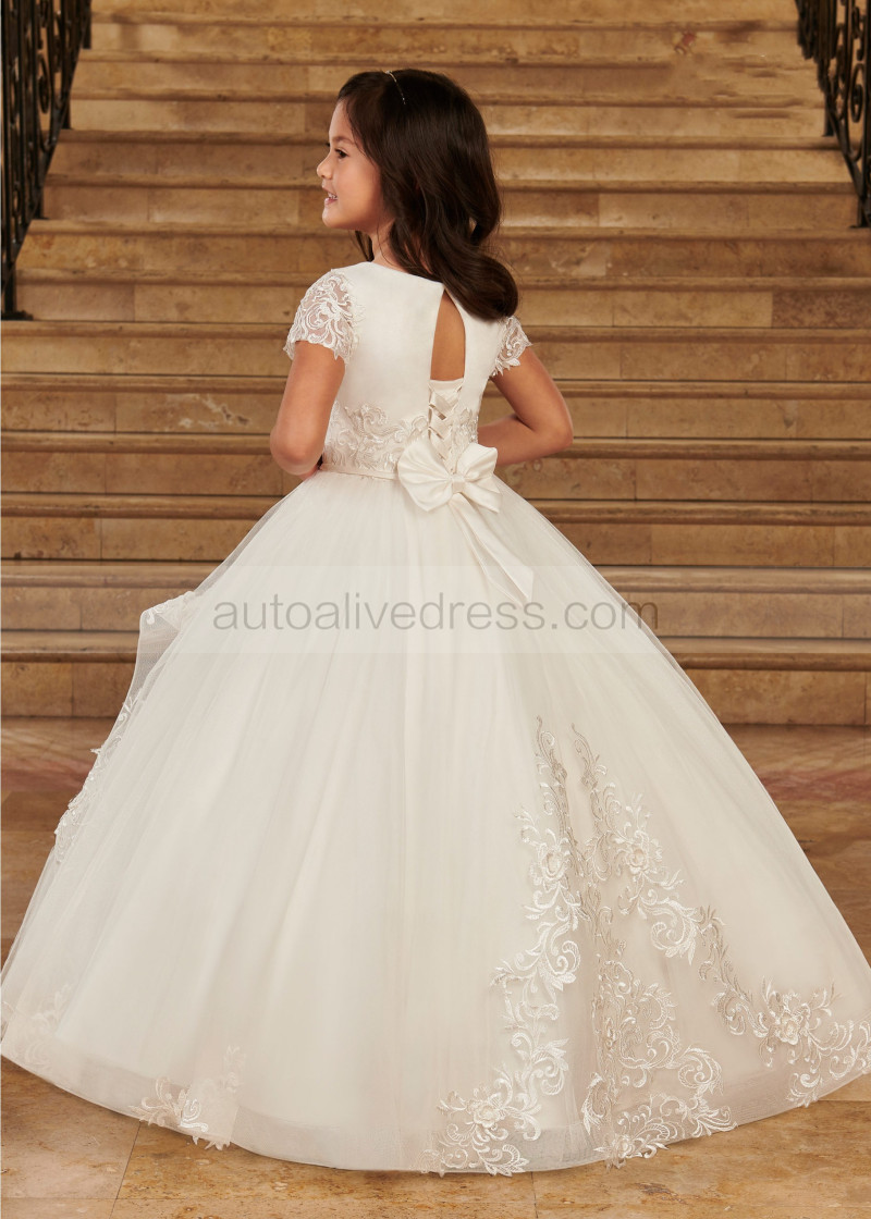 Short Sleeves Ivory Lace Tulle Keyhole Back Flower Girl Dress