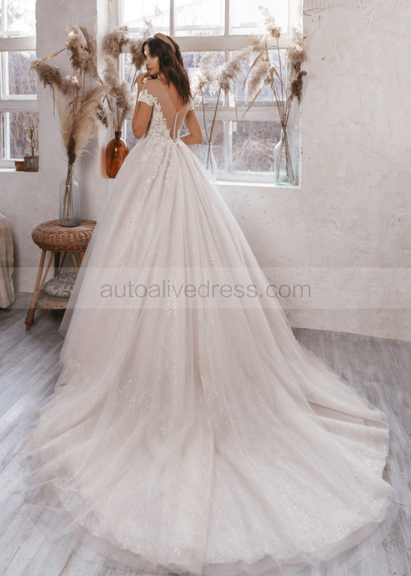 Short Sleeves Ivory Lace Tulle V Back Glitter Wedding Dress