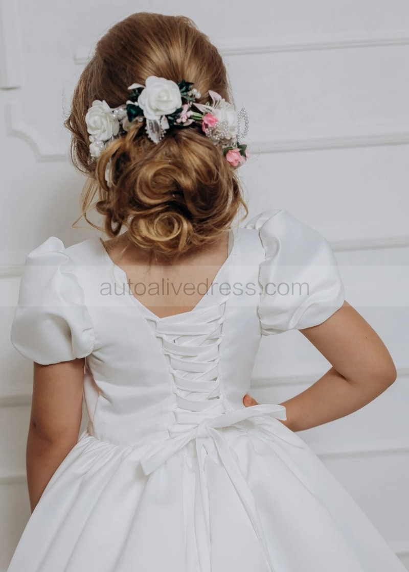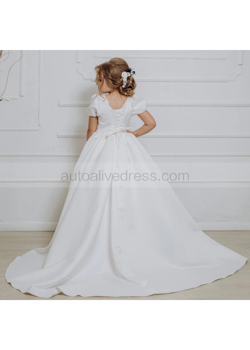 Short Sleeves Ivory Pleated Satin Flower Girl Dress