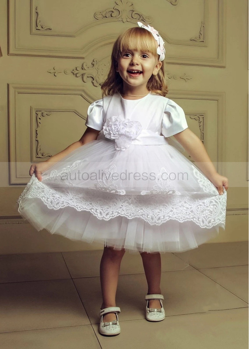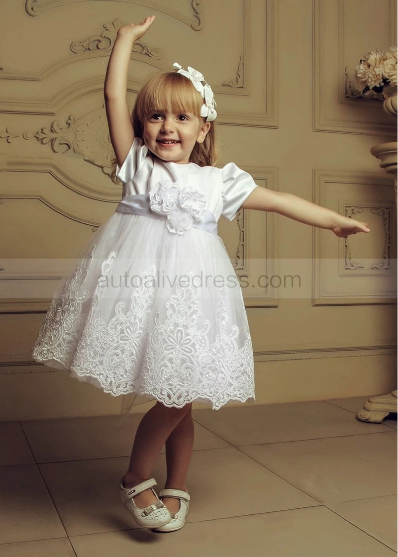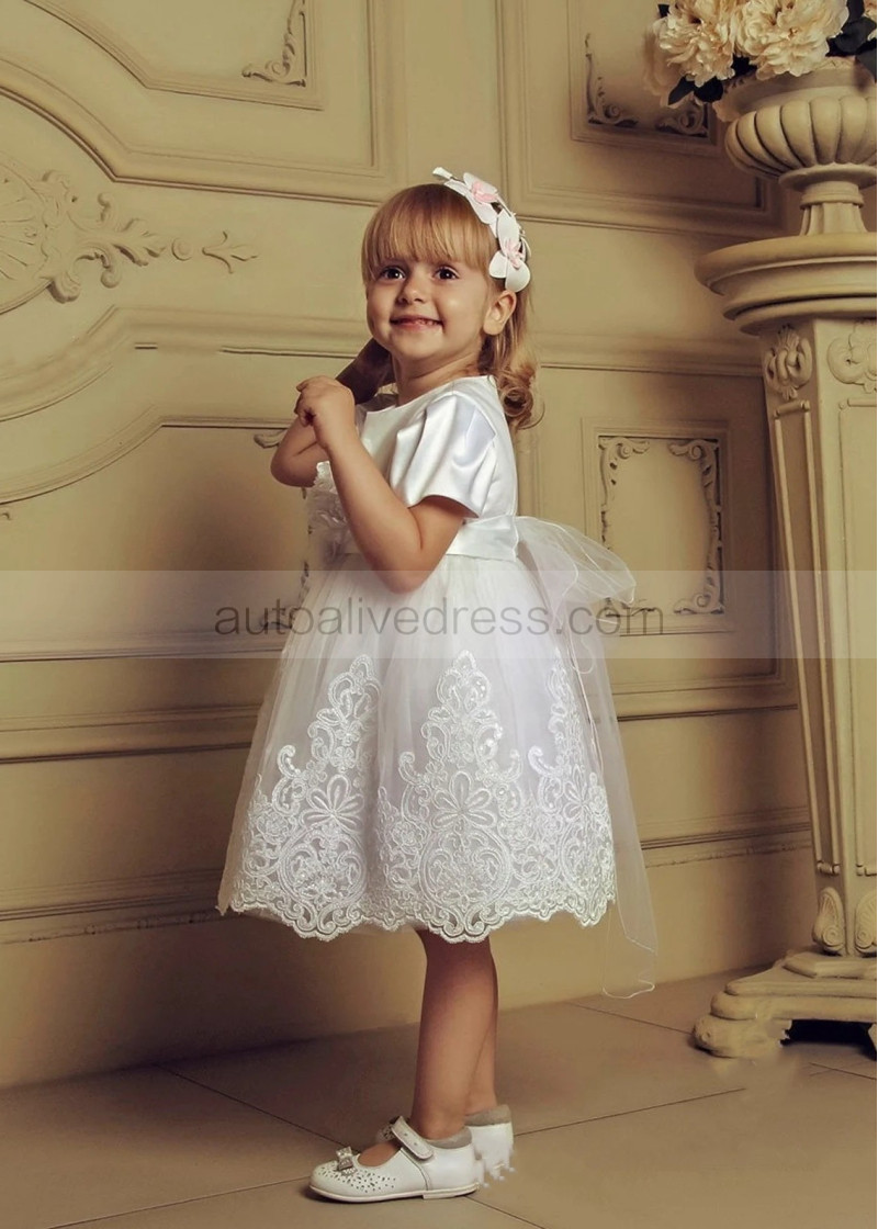 Short Sleeves Ivory Satin Lace Cute Flower Girl Dress