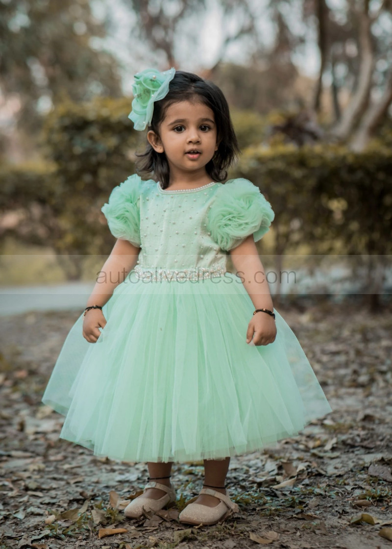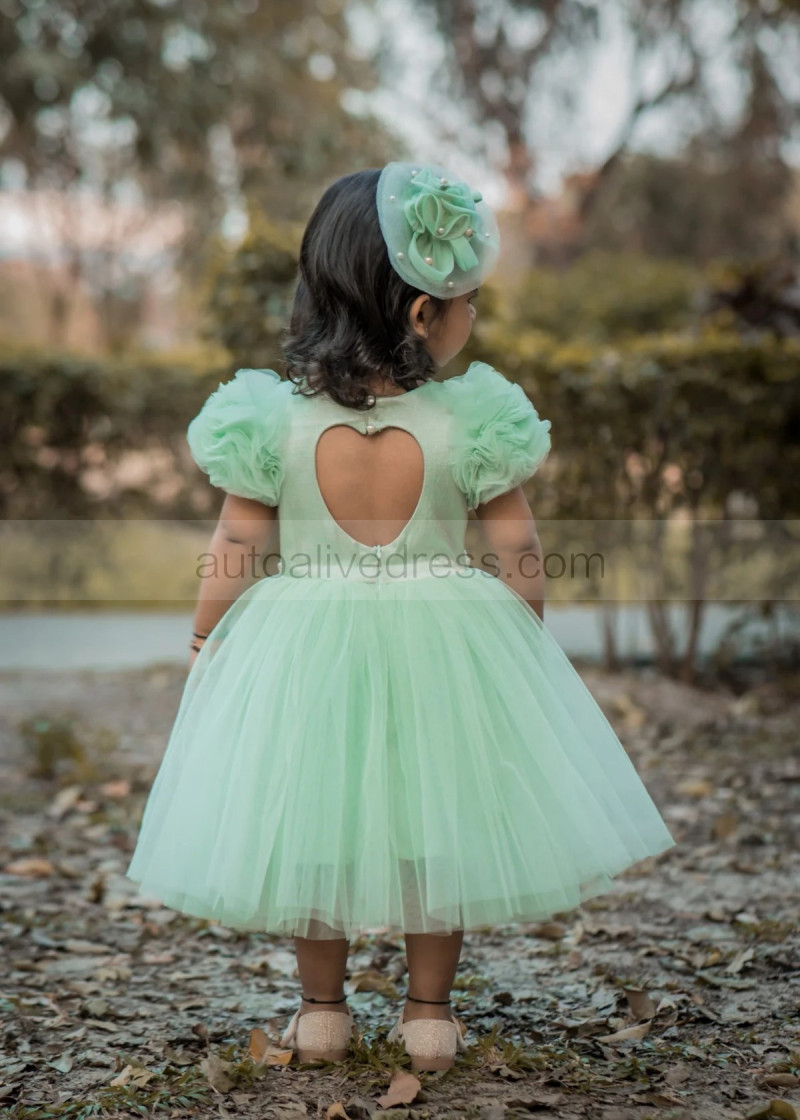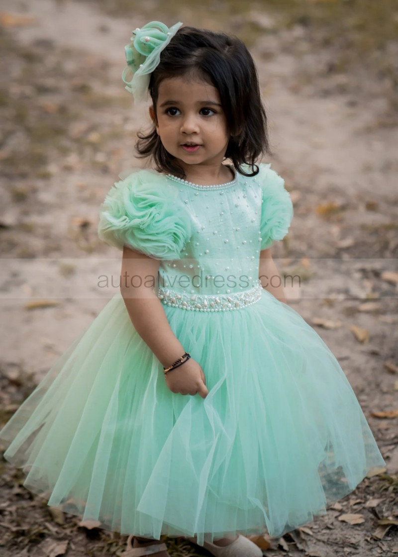 Short Sleeves Mint Tulle Pearls Beaded Fashion Flower Girl Dress