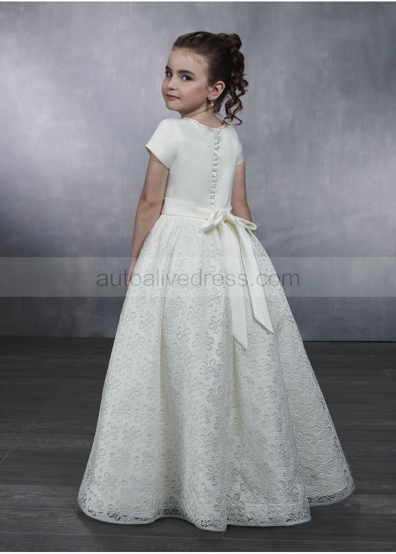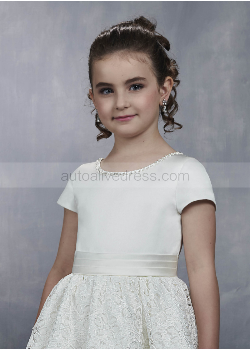 Short Sleeves Pearl Neck Ivory Satin Floral Lace Flower Girl Dress