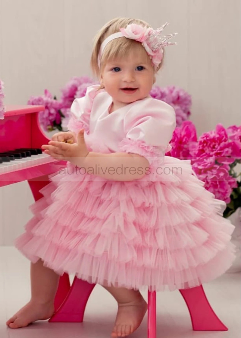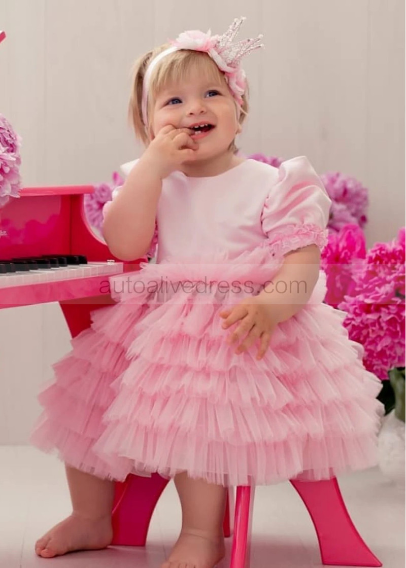 Short Sleeves Pink Satin Tulle Tiered Flower Girl Dress