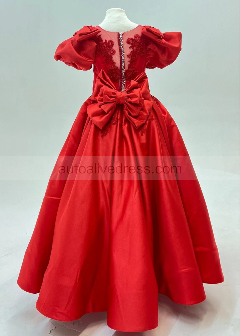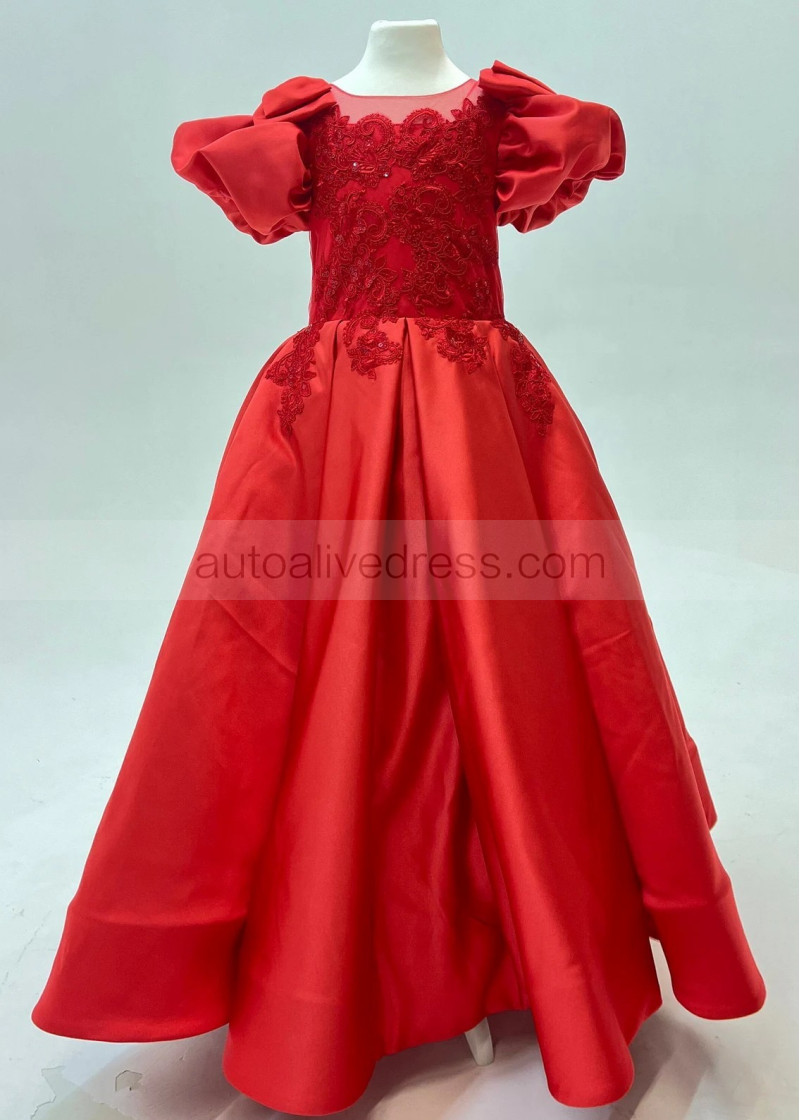 Short Sleeves Red Lace Satin Flower Girl Dress
