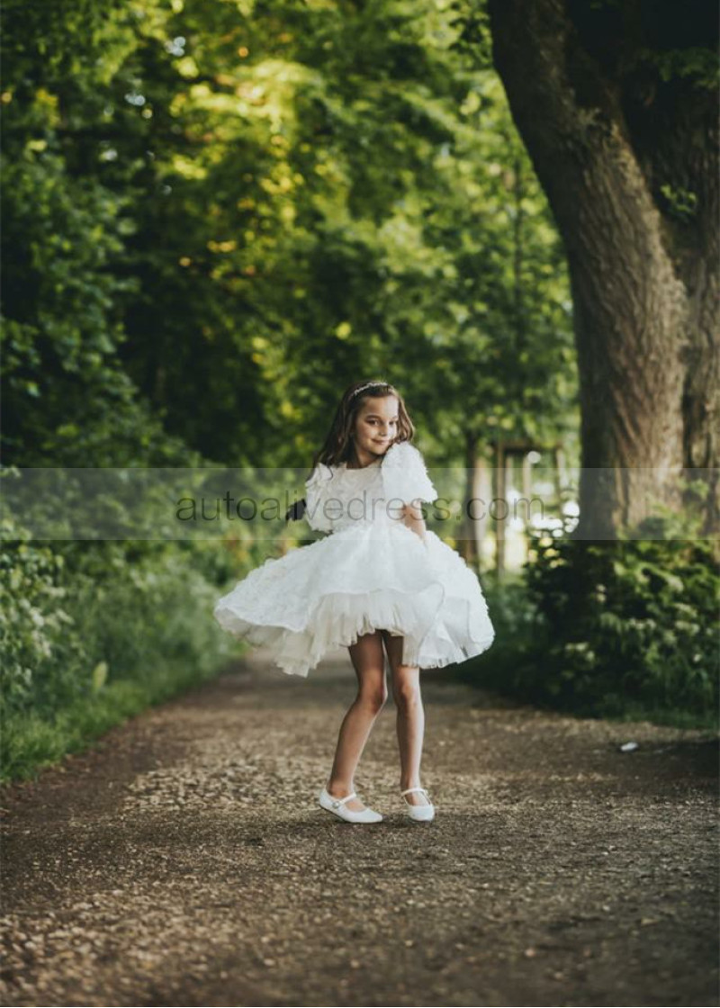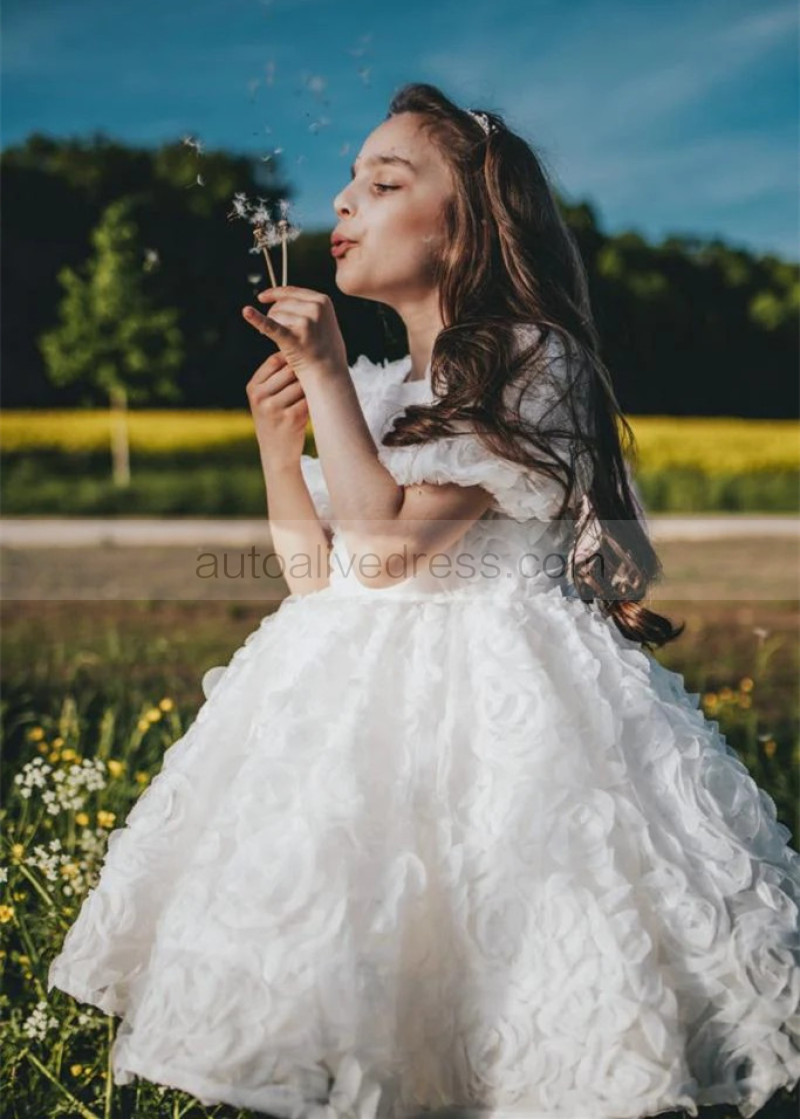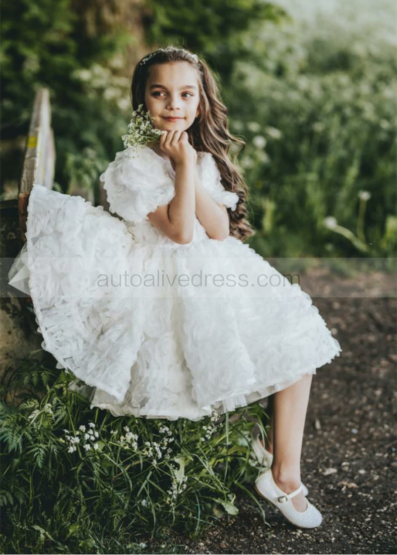 Short Sleeves White Rosetta Tulle Floral Flower Girl Dress