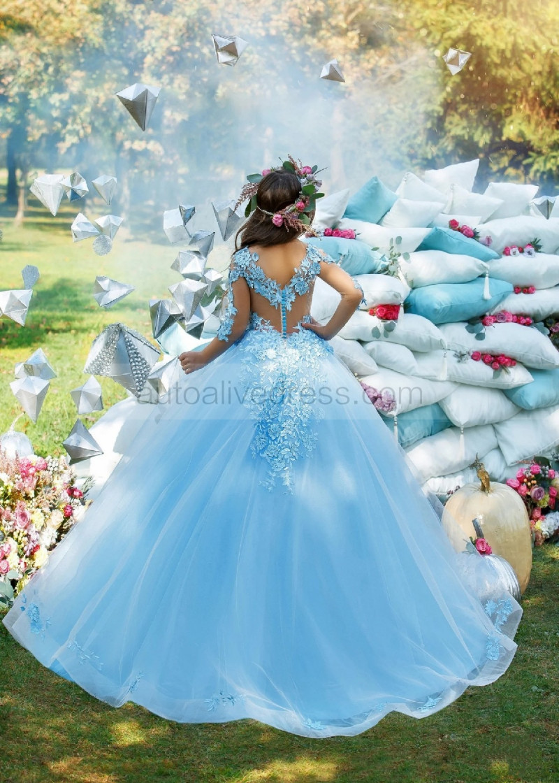 Sky Blue Lace Tulle V Back Gorgeous Flower Girl Dress