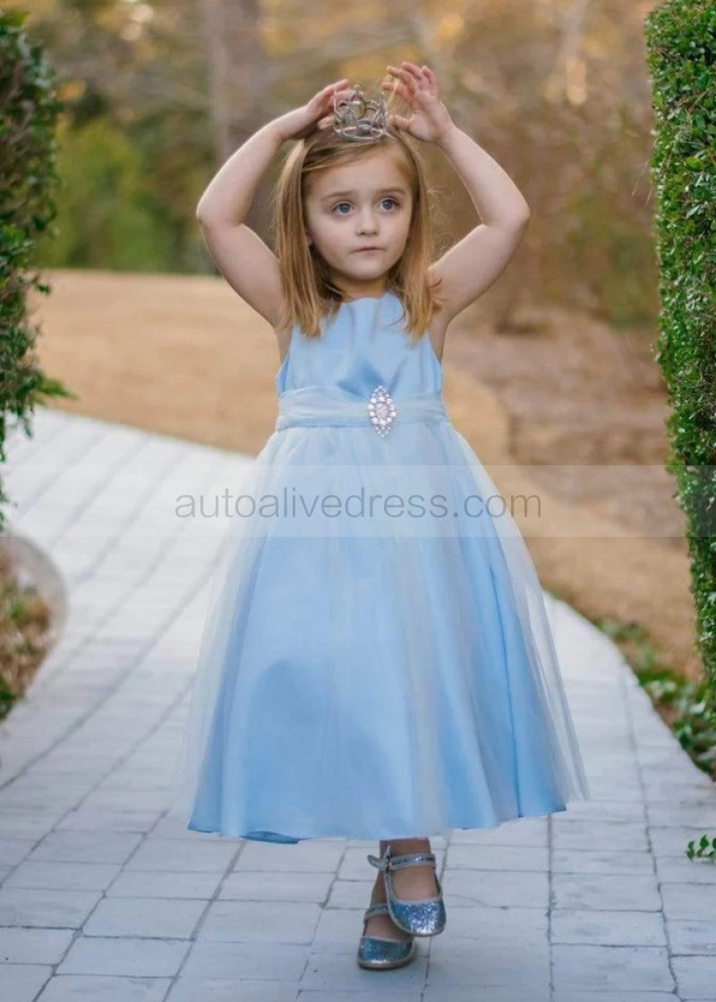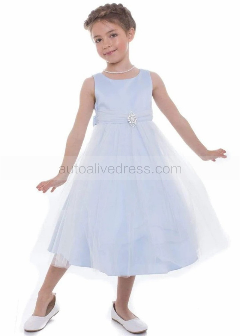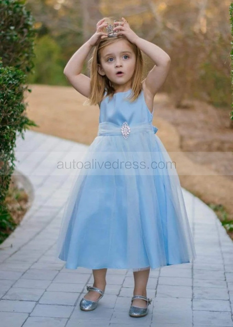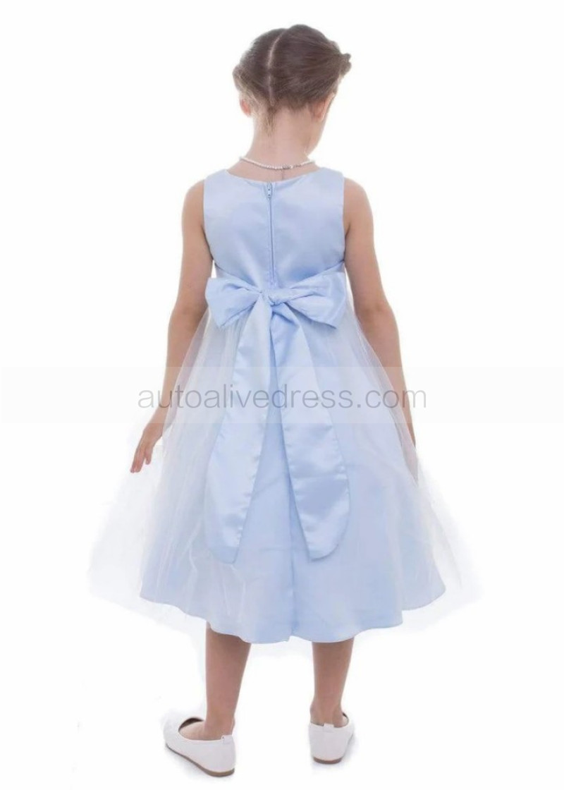 Sky Blue Satin Tulle Tea Length Sweet Flower Girl Dress