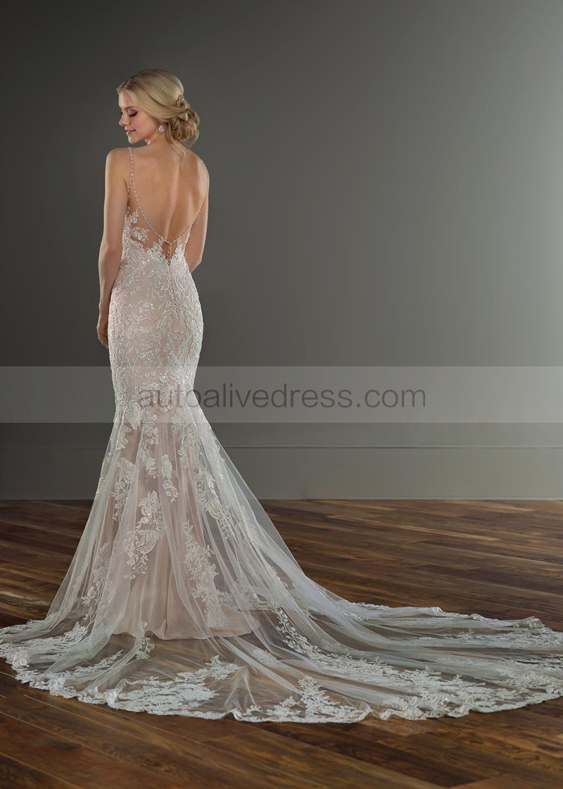 Sleeveless Beaded Ivory Lace Tulle Deep V Back Wedding Dress With Pink Lining