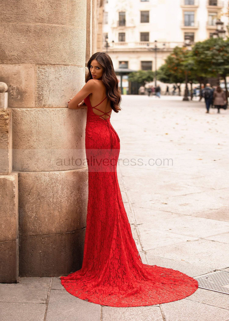 Spaghetti Straps Deep V Neck Red Lace Evening Dress