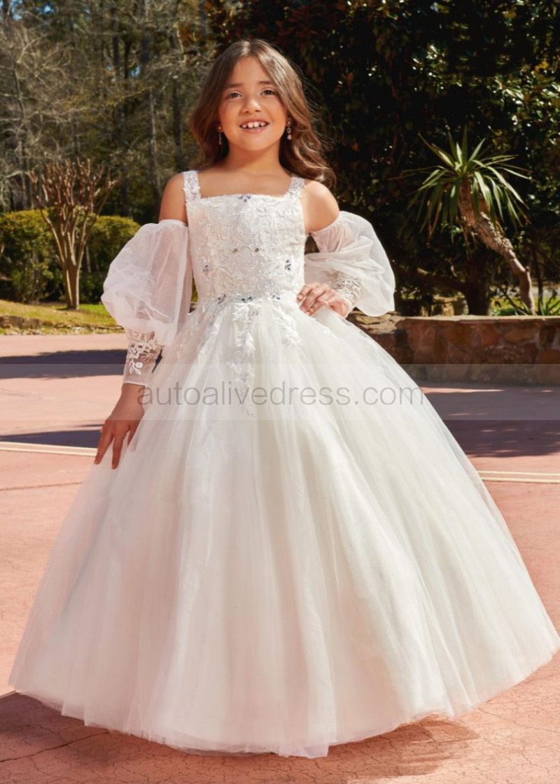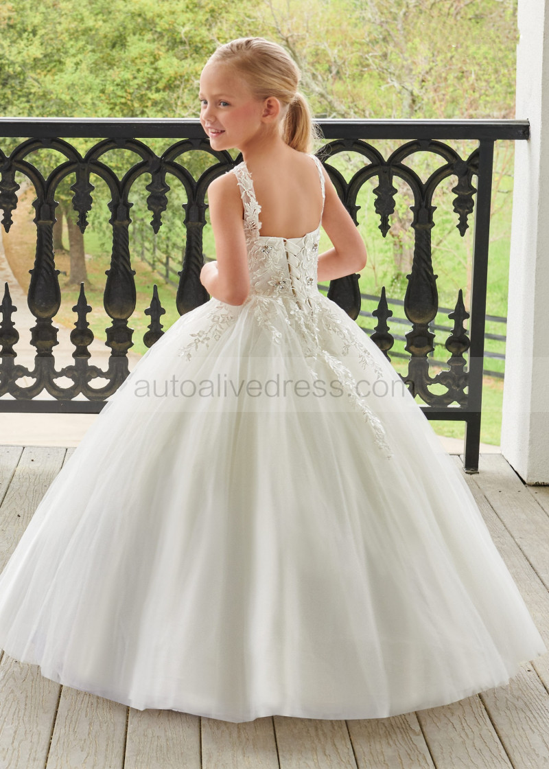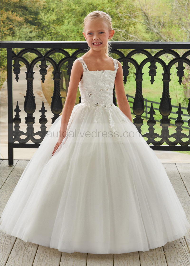 Square Neck Beaded Ivory Lace Tulle Cute Flower Girl Dress
