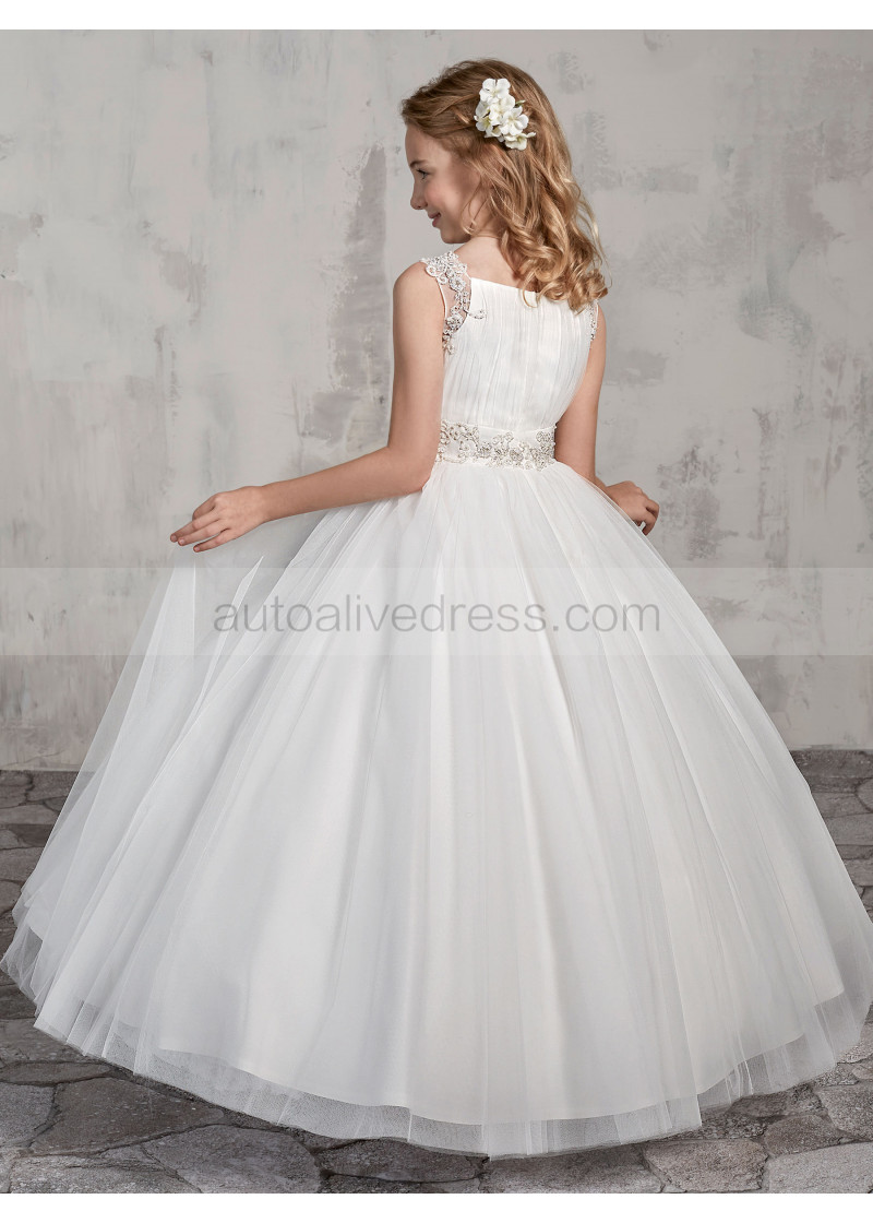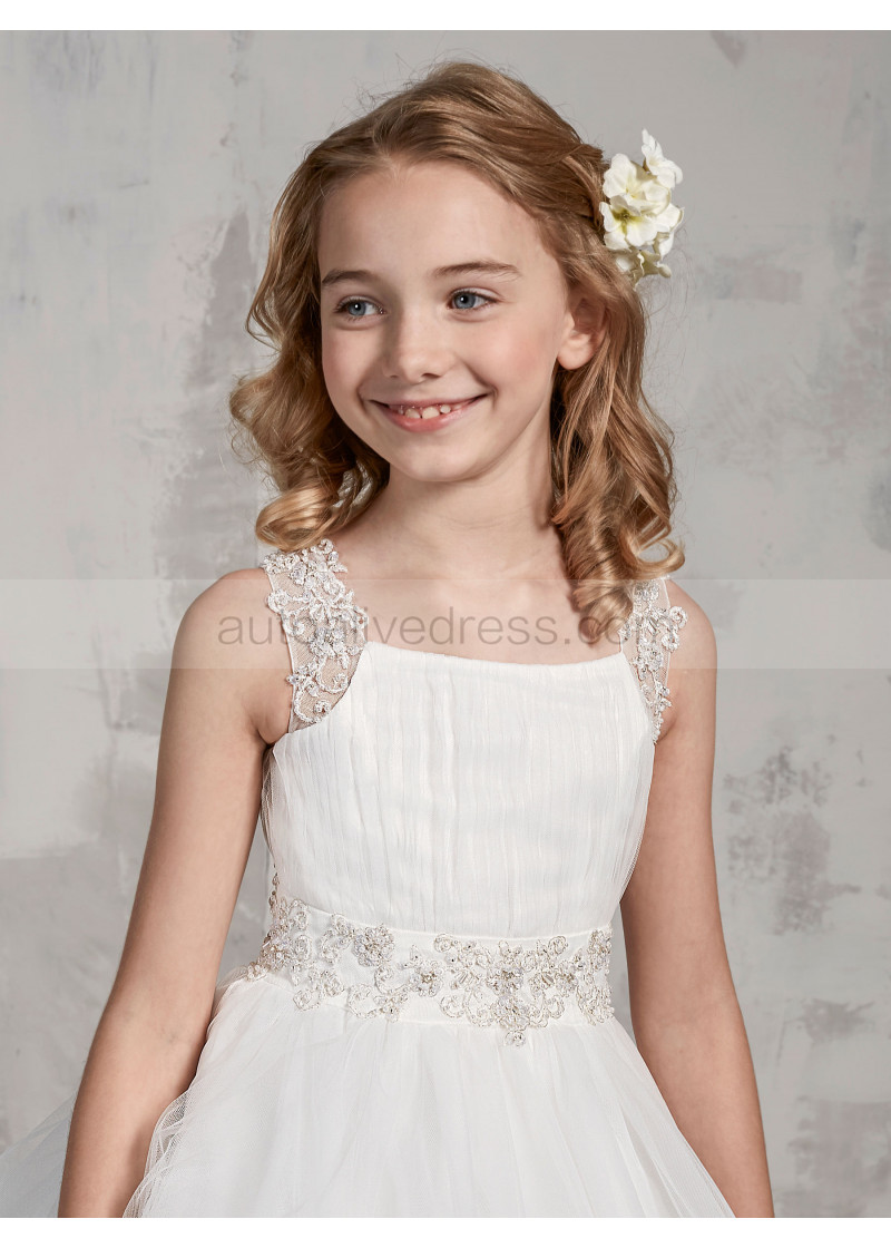 Square Neck Ivory Ruched Tulle Flowy Flower Girl Dress