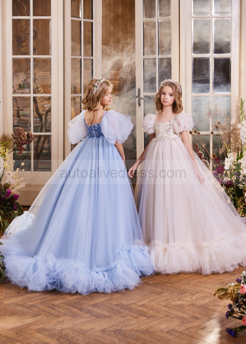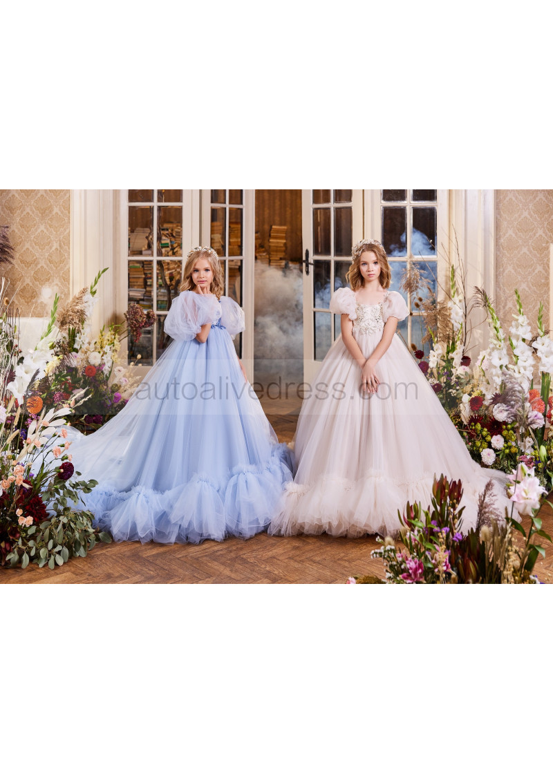 Square Neck Sequined Beaded Lace Tulle Stunning Flower Girl Dress