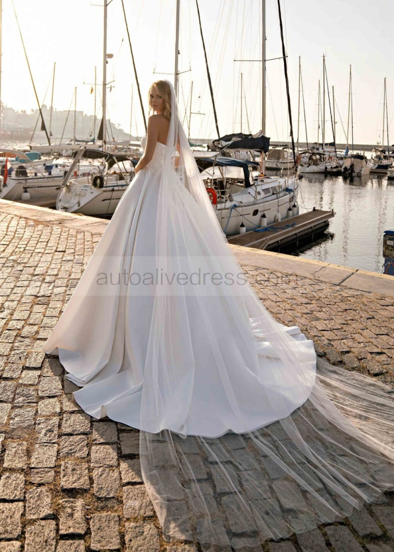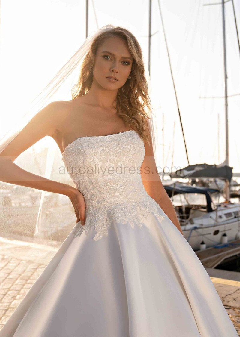 Strapless Beaded Ivory Lace Satin Unique Wedding Dress