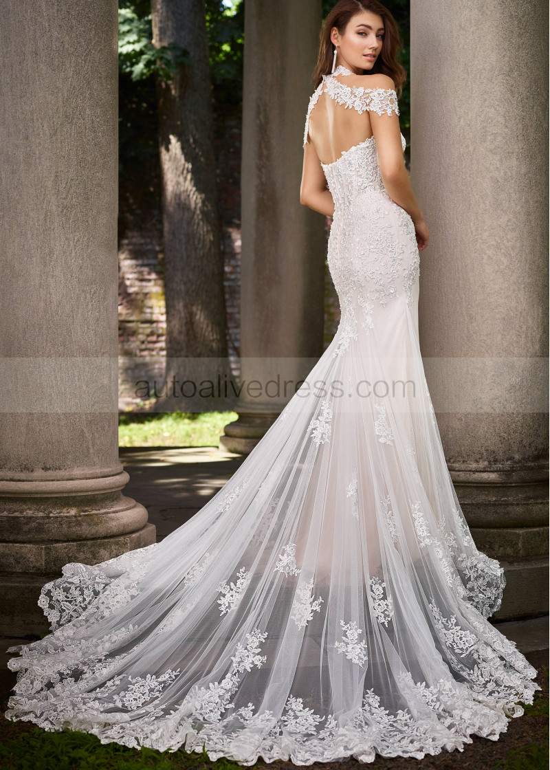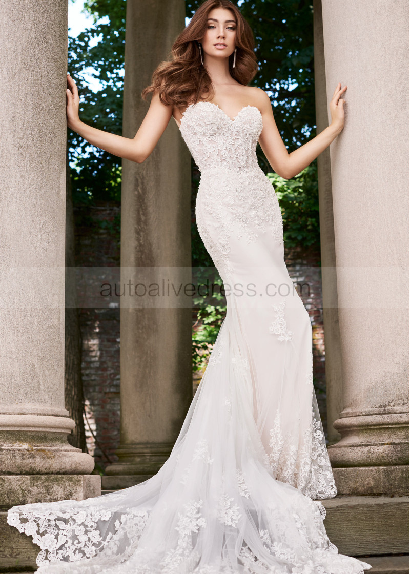 Strapless Beaded Ivory Lace Tulle Romantic Wedding Dress