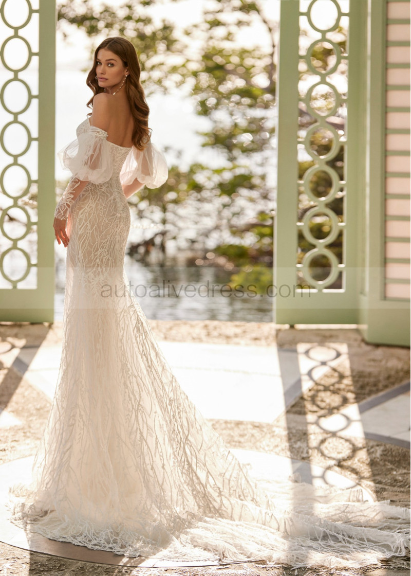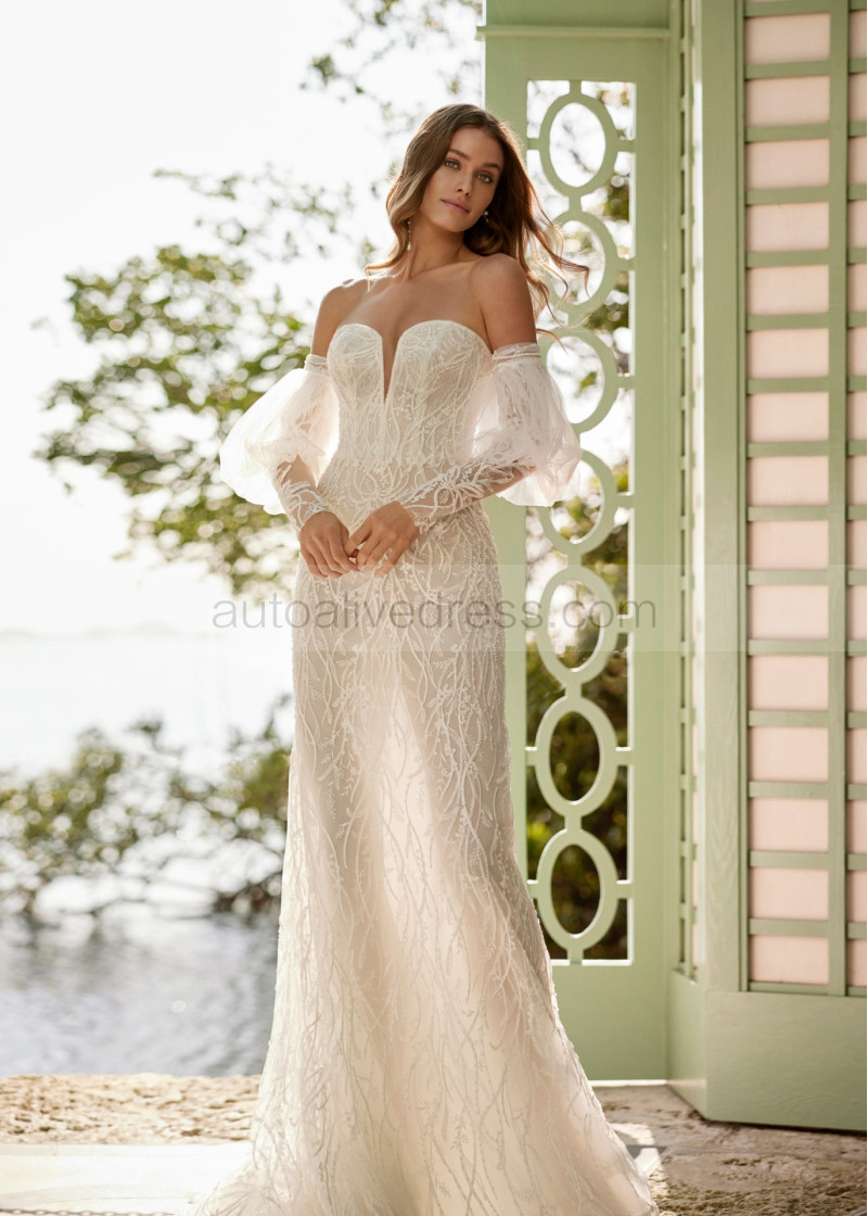Strapless Beaded Ivory Lace Tulle Sexy Wedding Dress With Detachable Sleeves