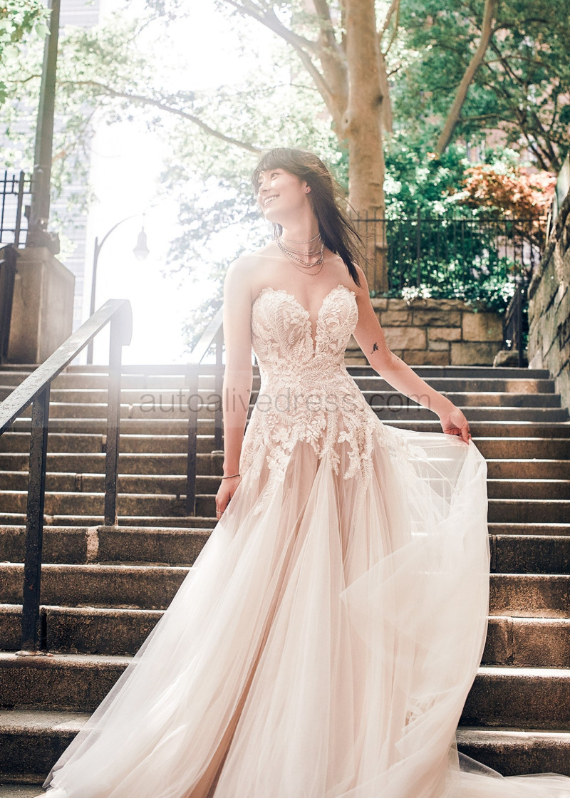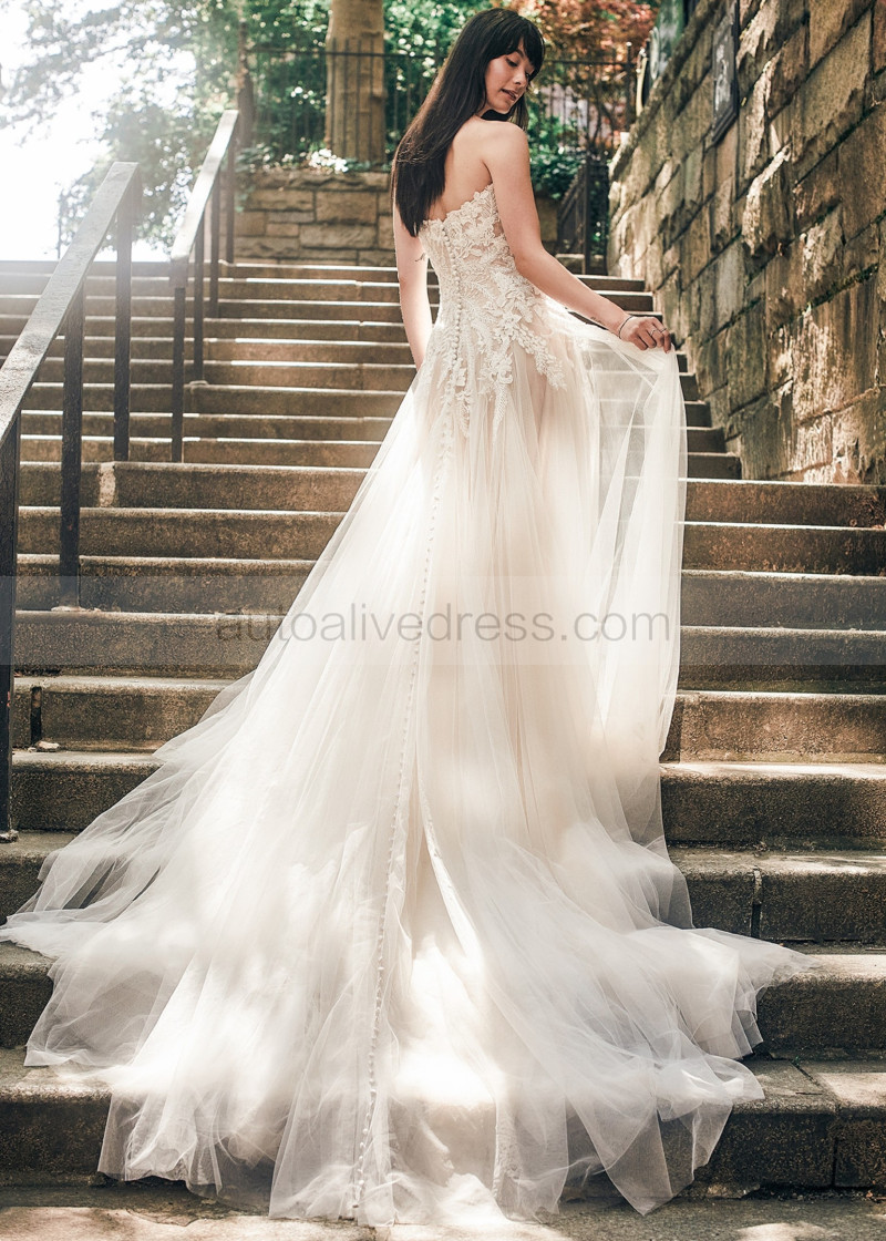 Strapless Beaded Ivory Lace Tulle Wedding Dress With Buttons