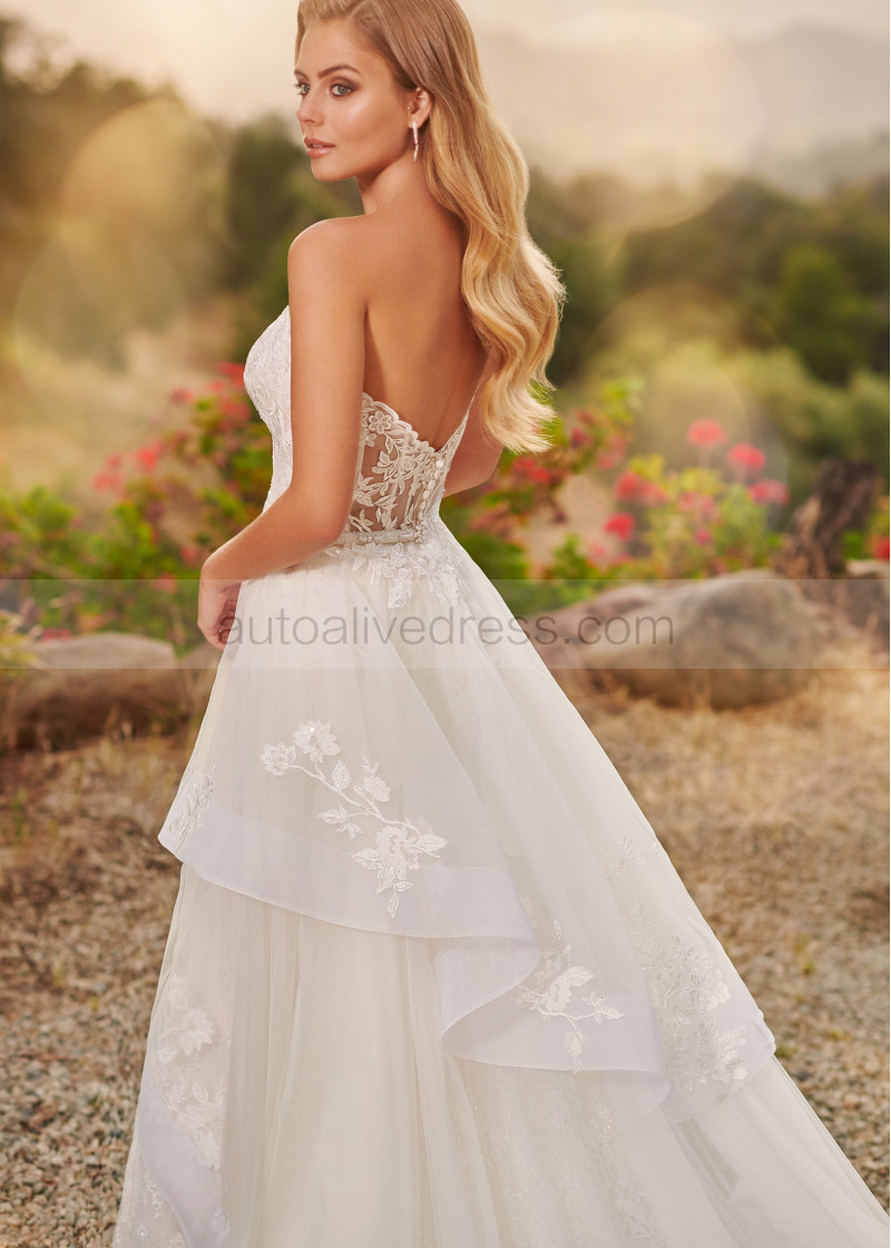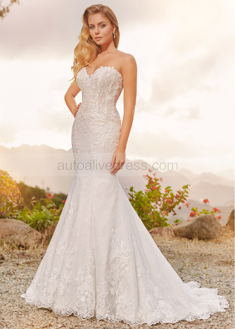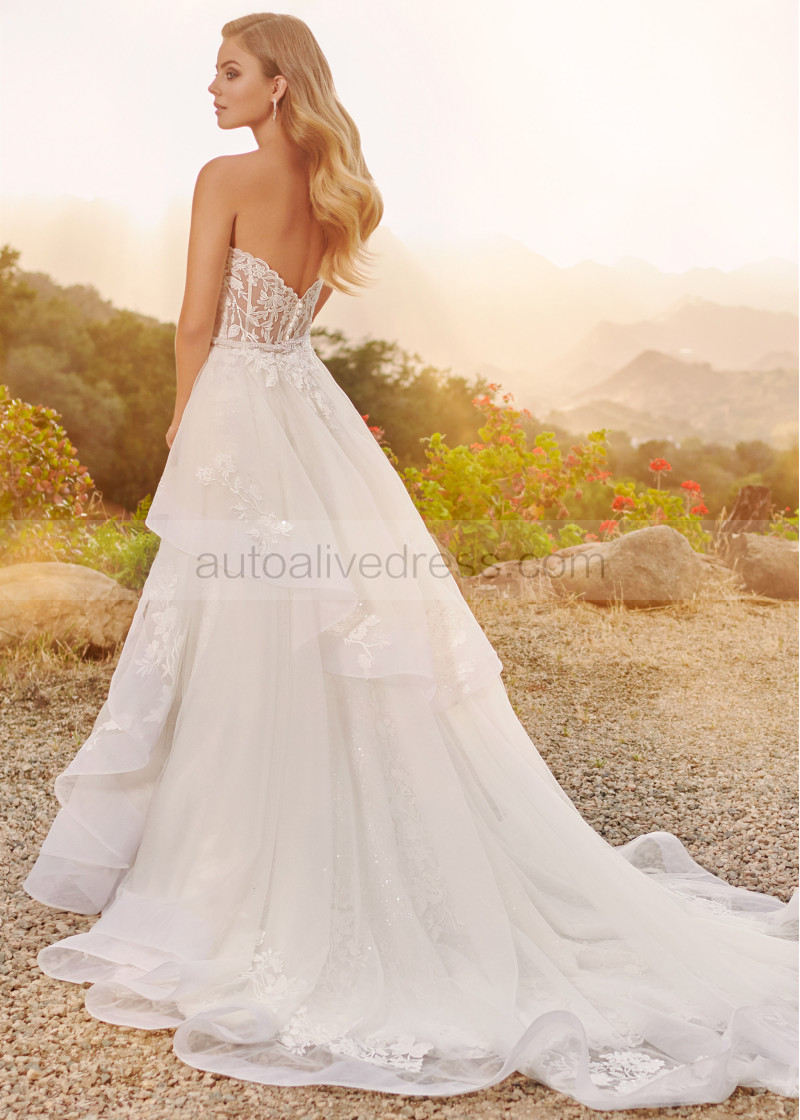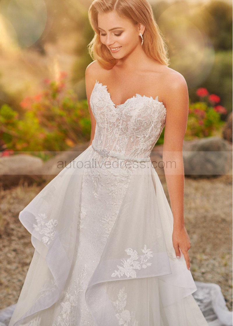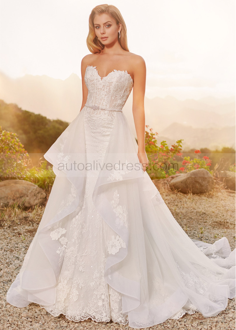 Strapless Beaded Ivory Lace Tulle Wedding Dress With Detachable Train