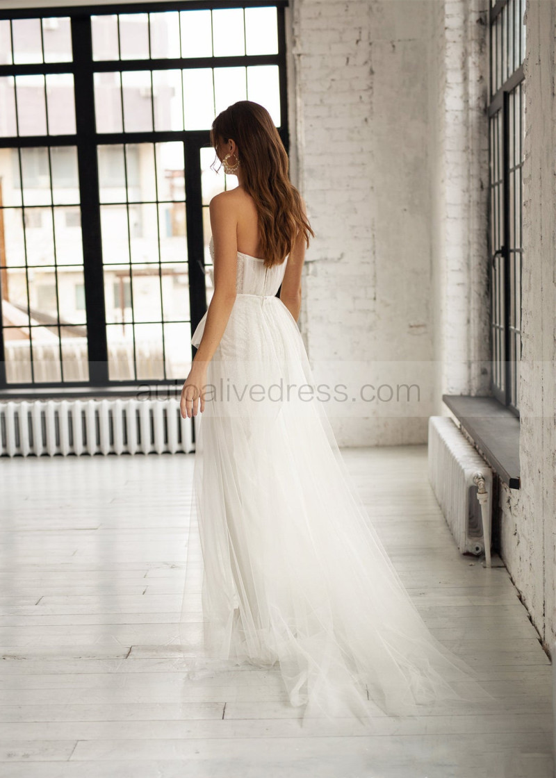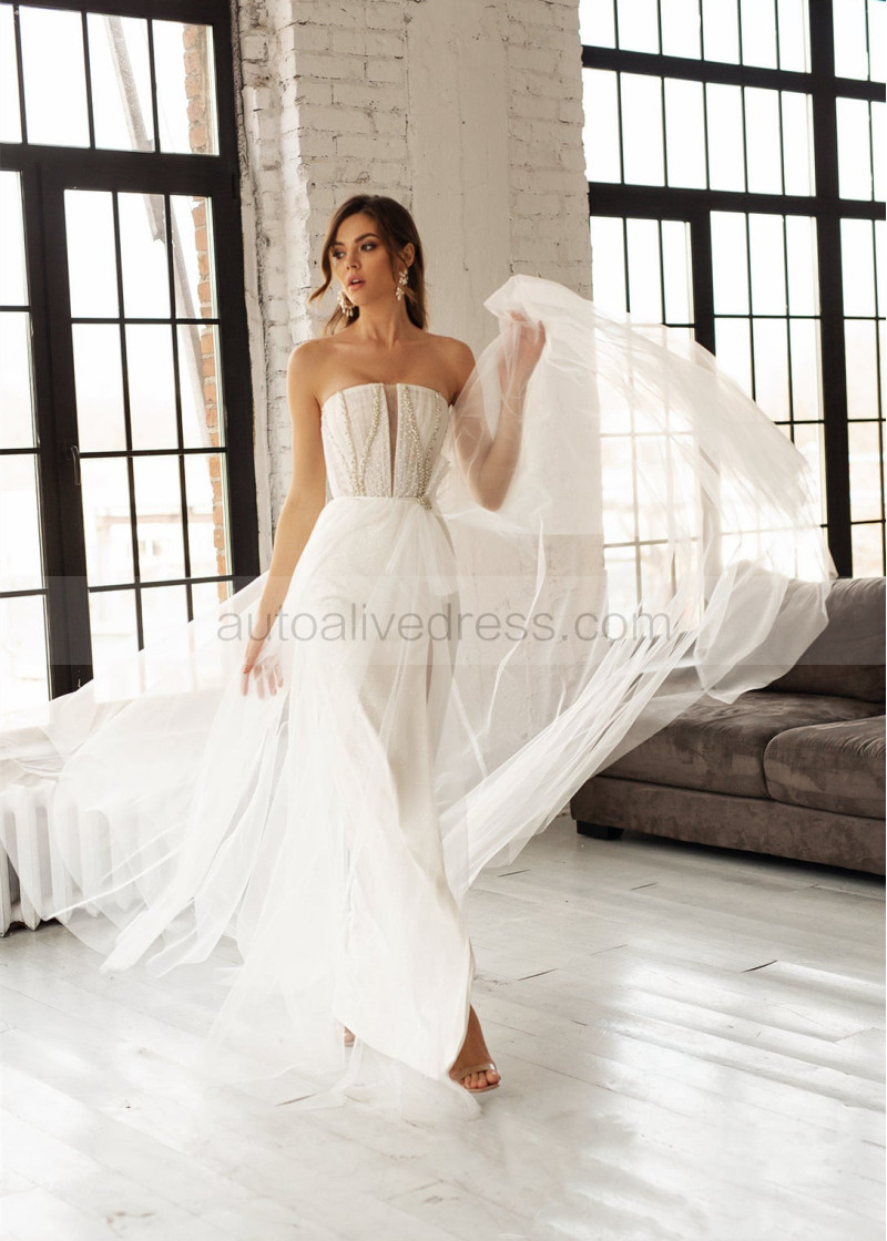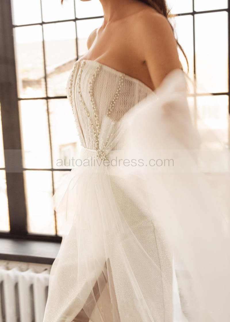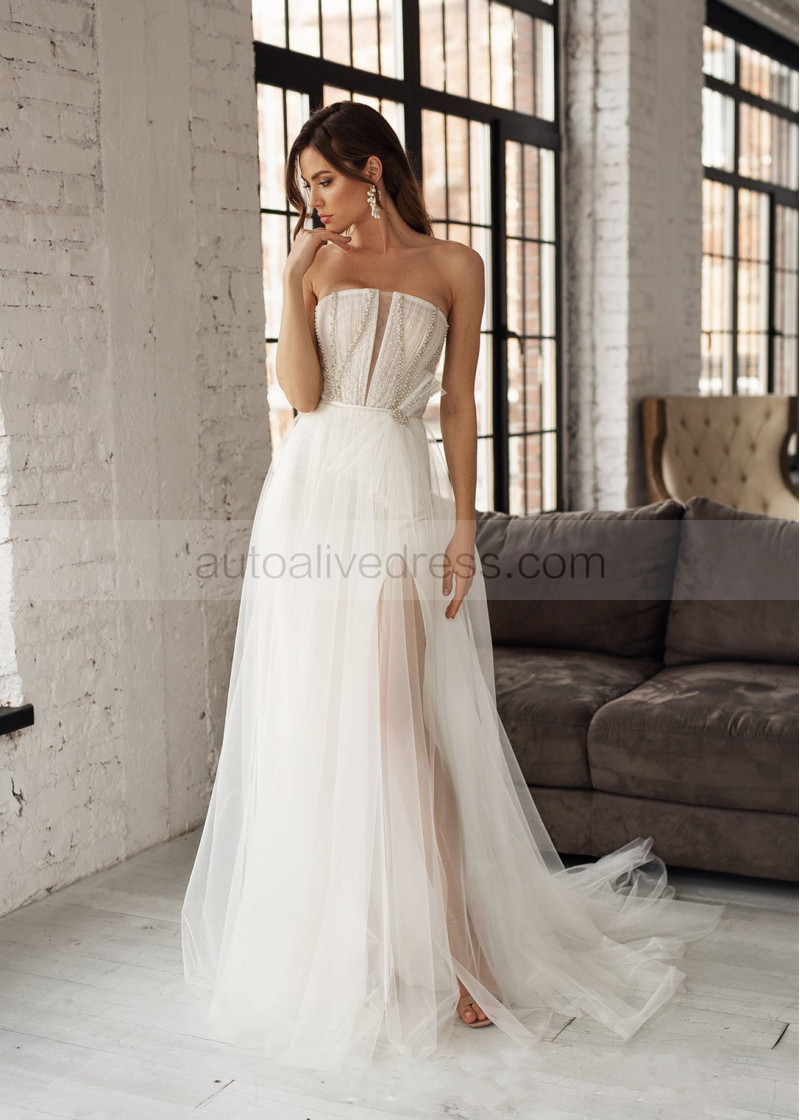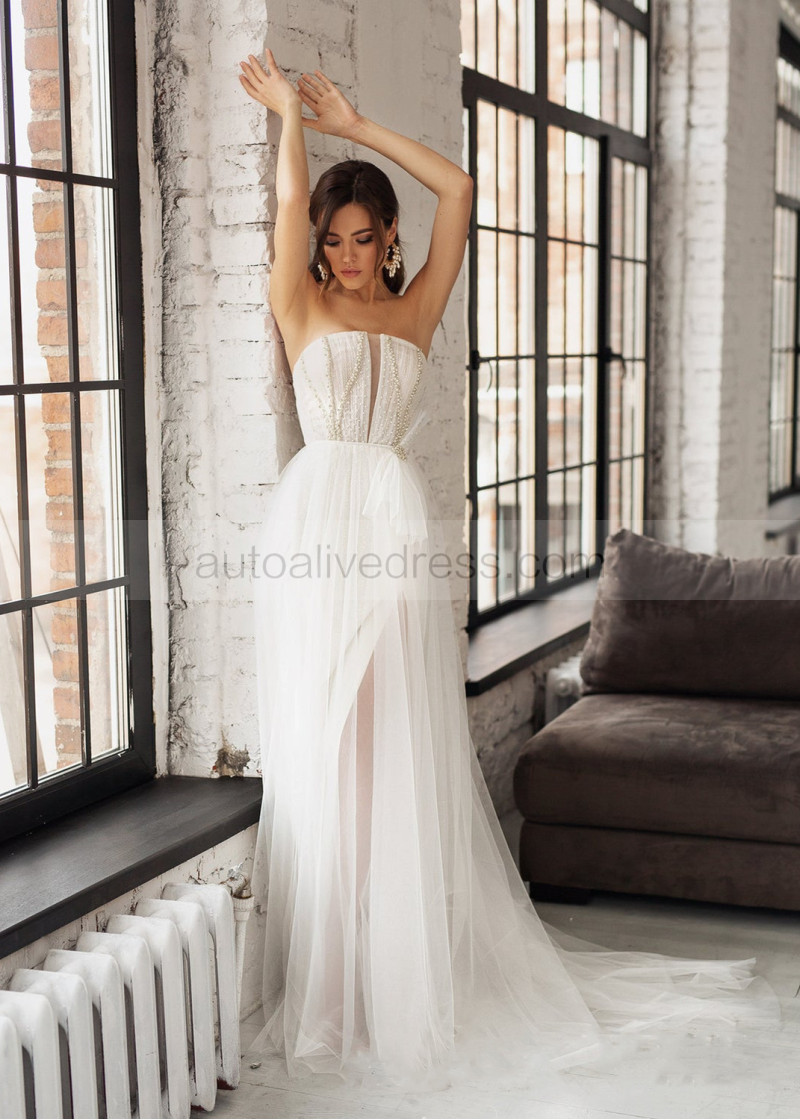 Strapless Beaded Ivory Tulle Slit Wedding Dress