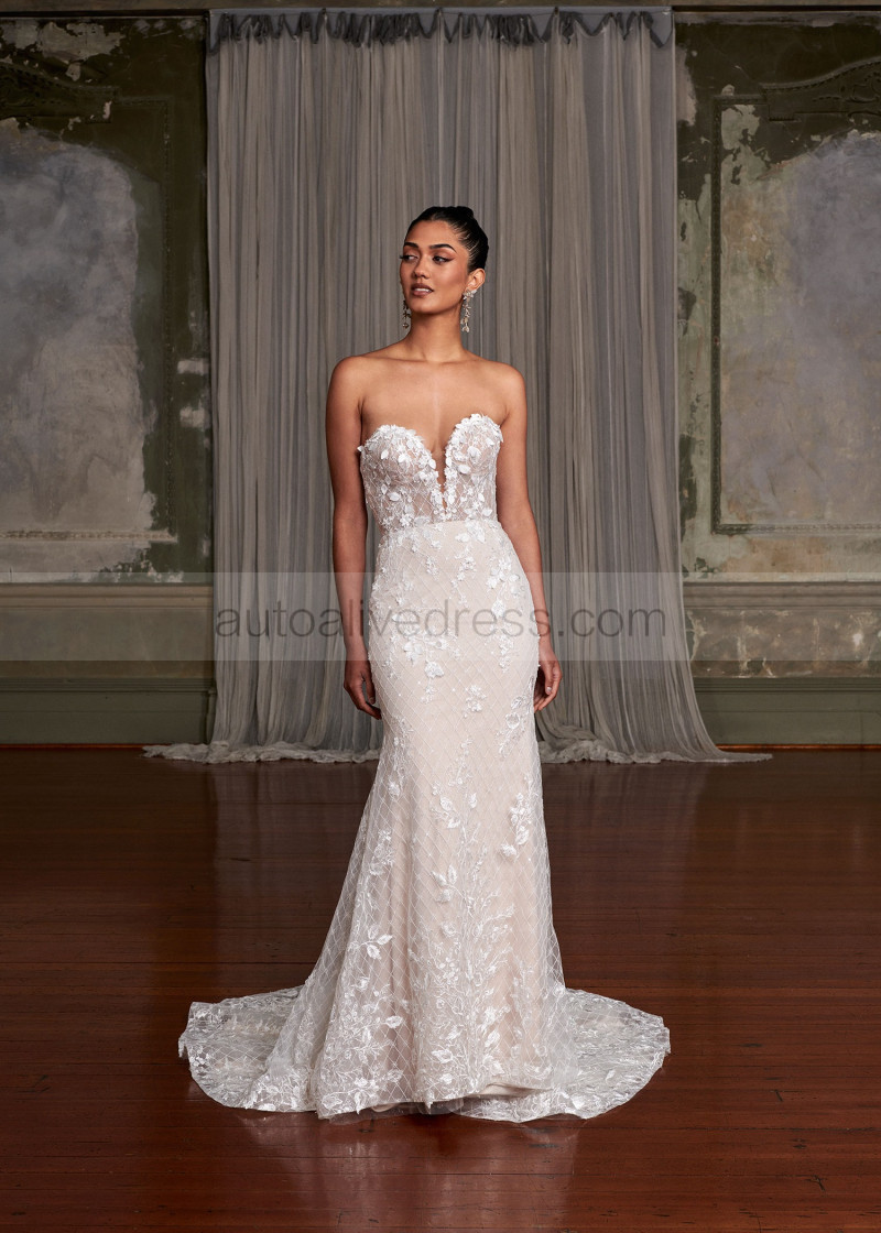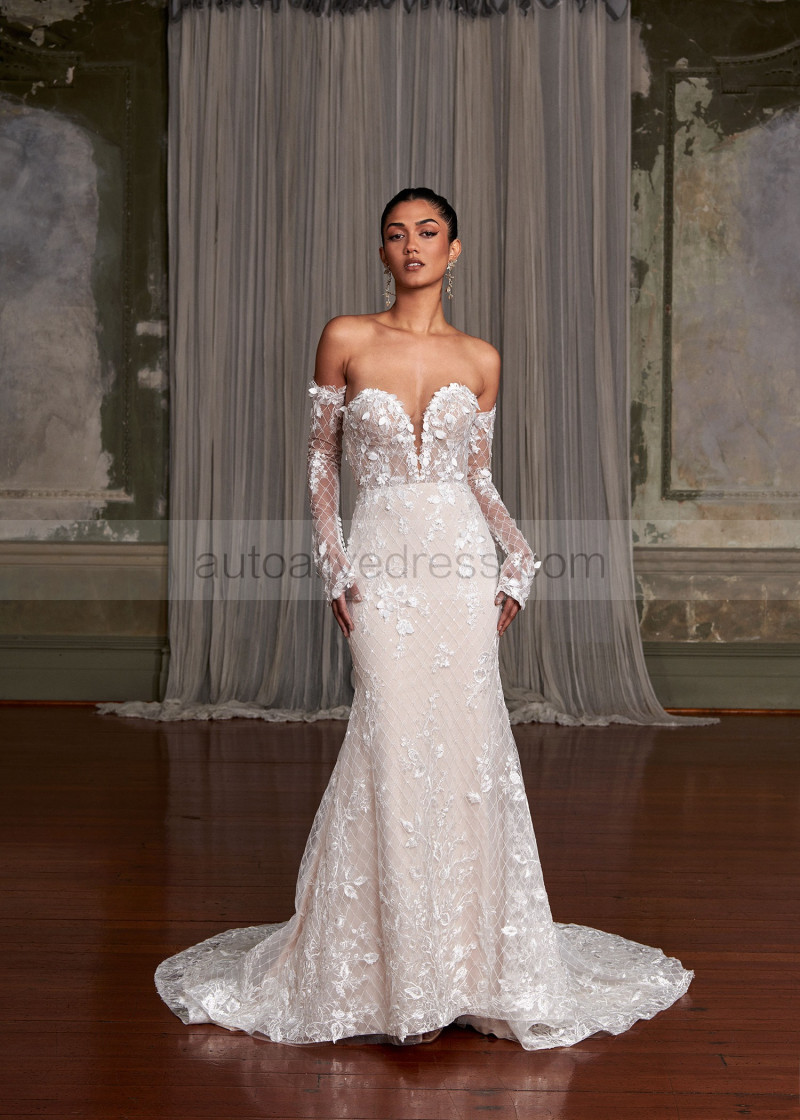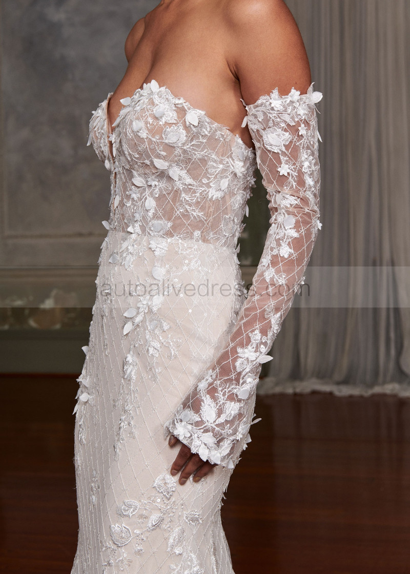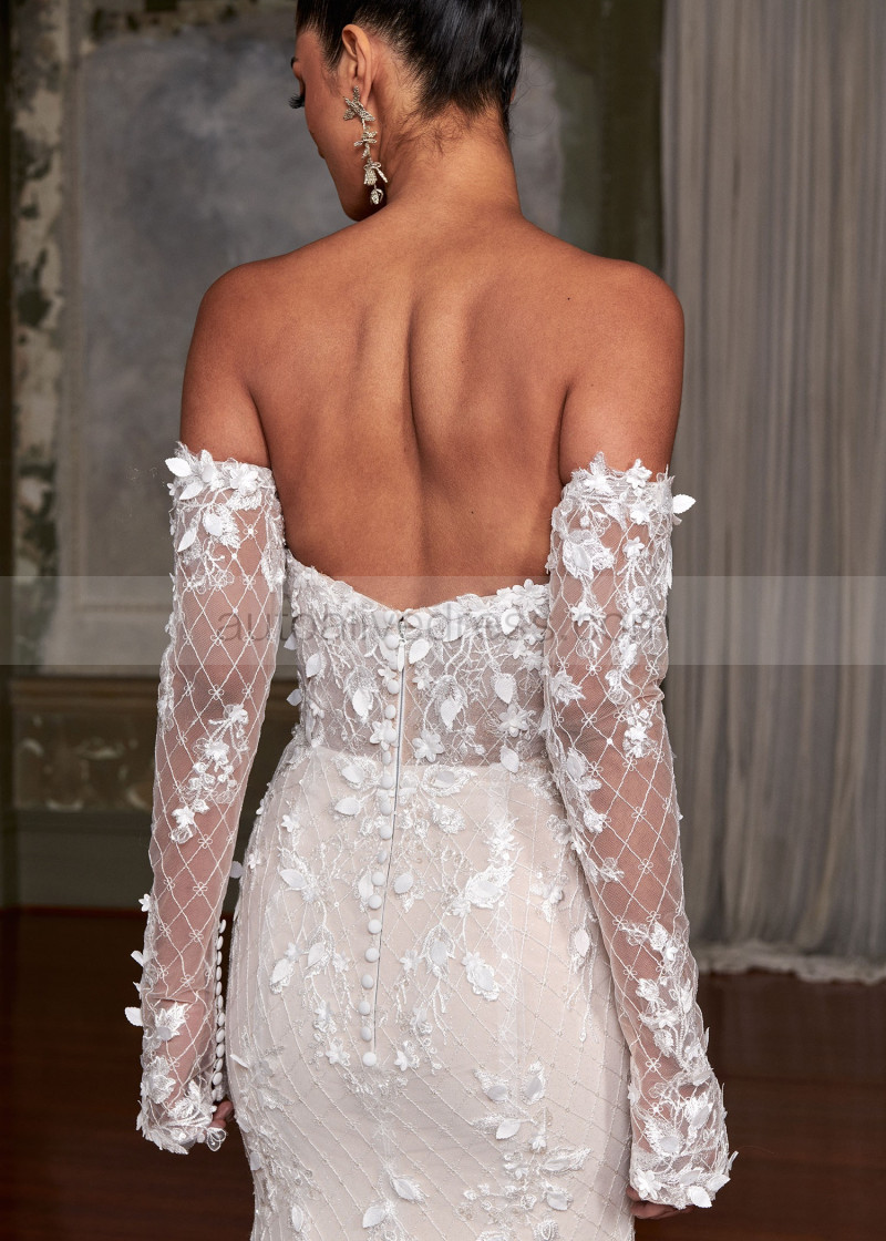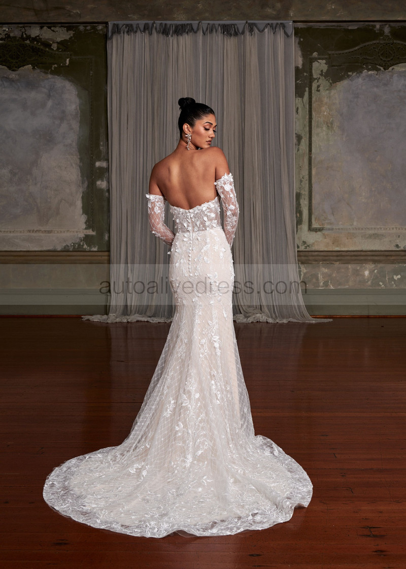 Strapless Ivory Lace Glitter Tulle Wedding Dress With Detachable Sleeves