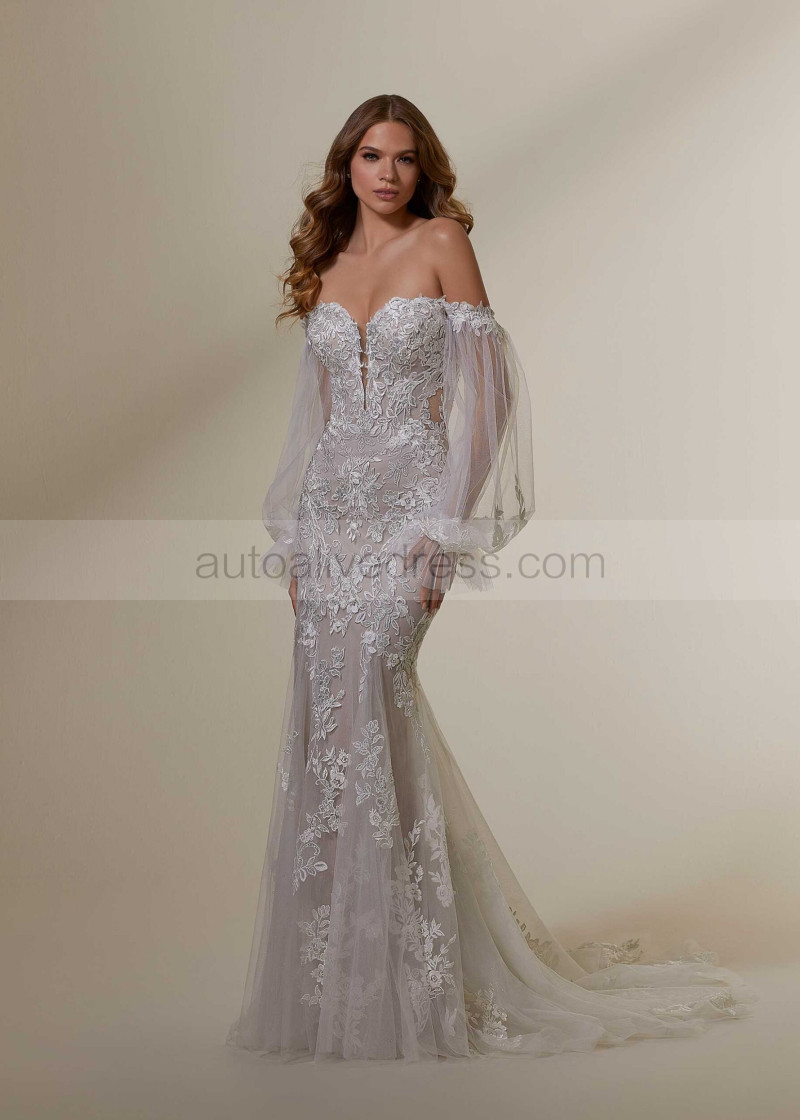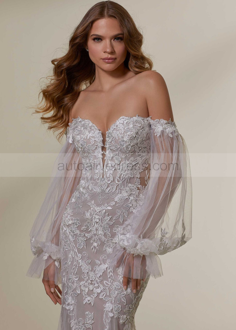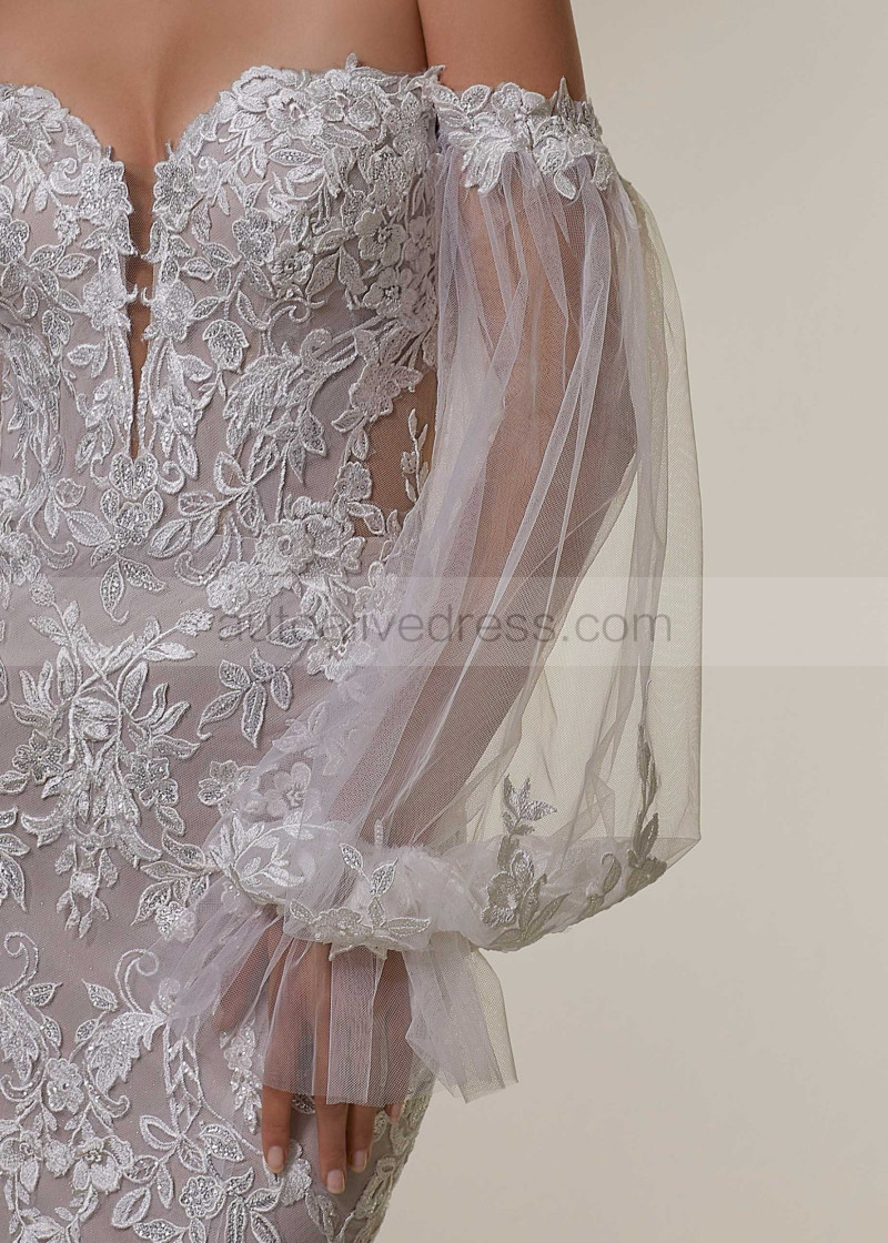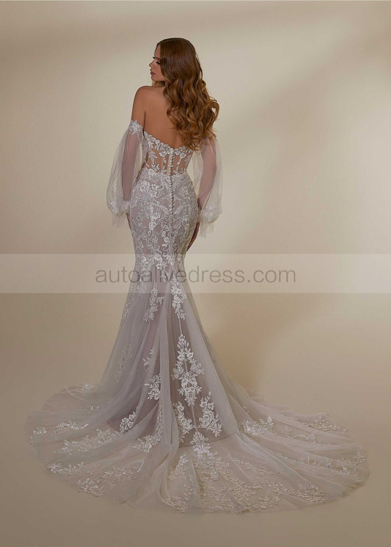 Strapless Lace Tulle Glitter Wedding Dress With Detachable Sleeves