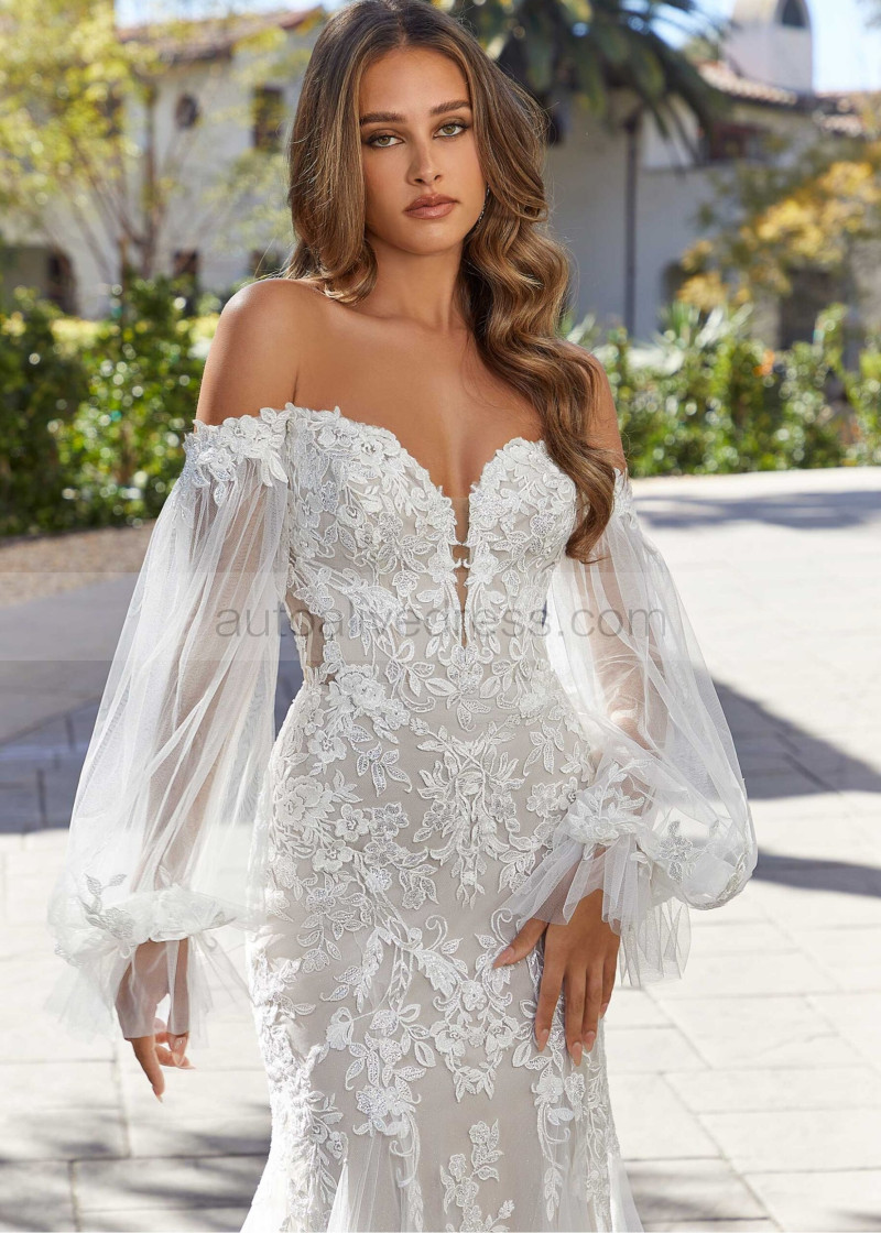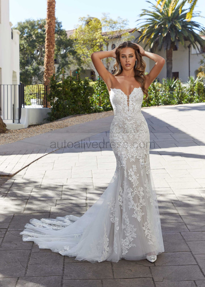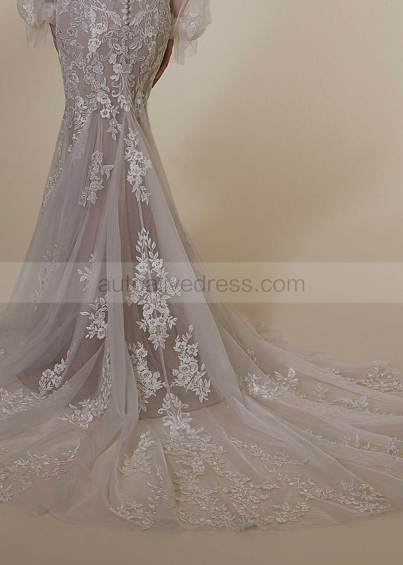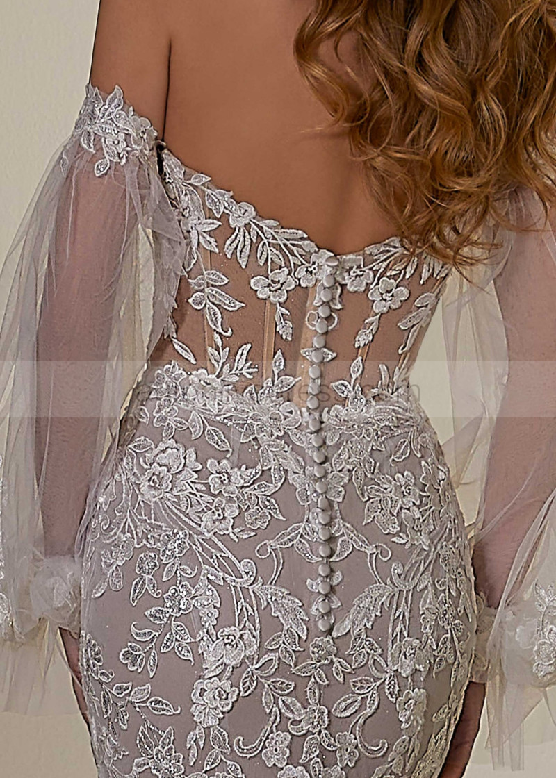 Strapless Lace Tulle Glitter Wedding Dress With Detachable Sleeves