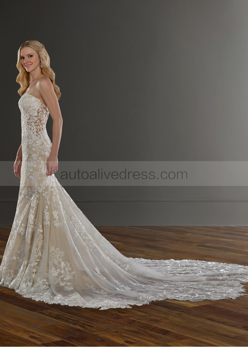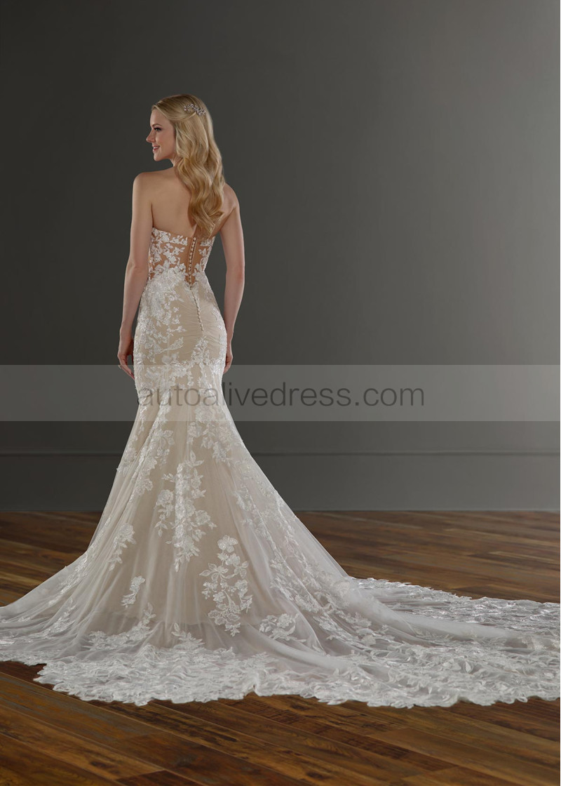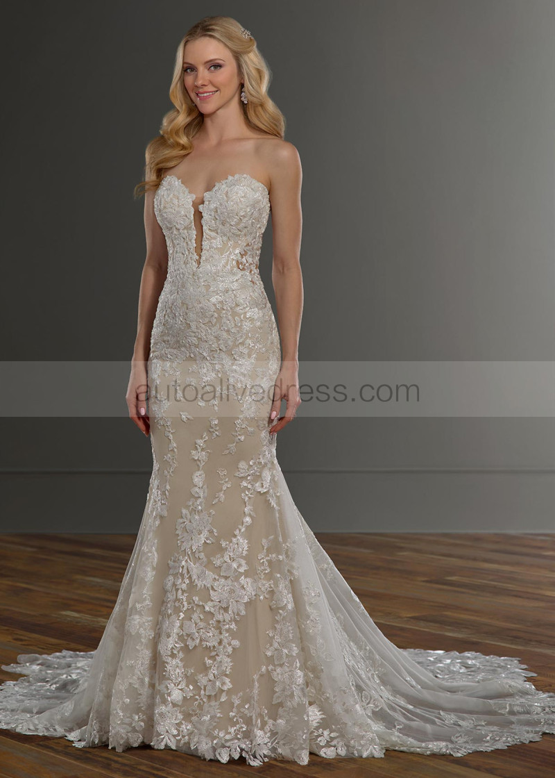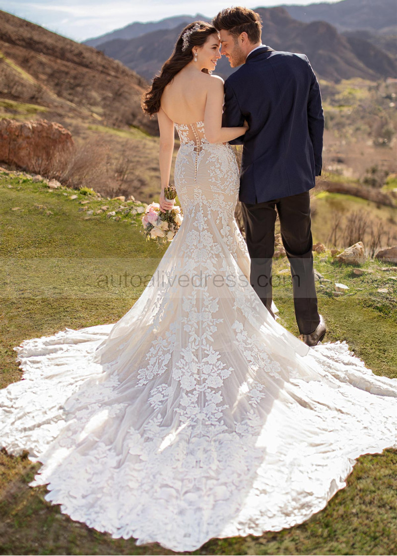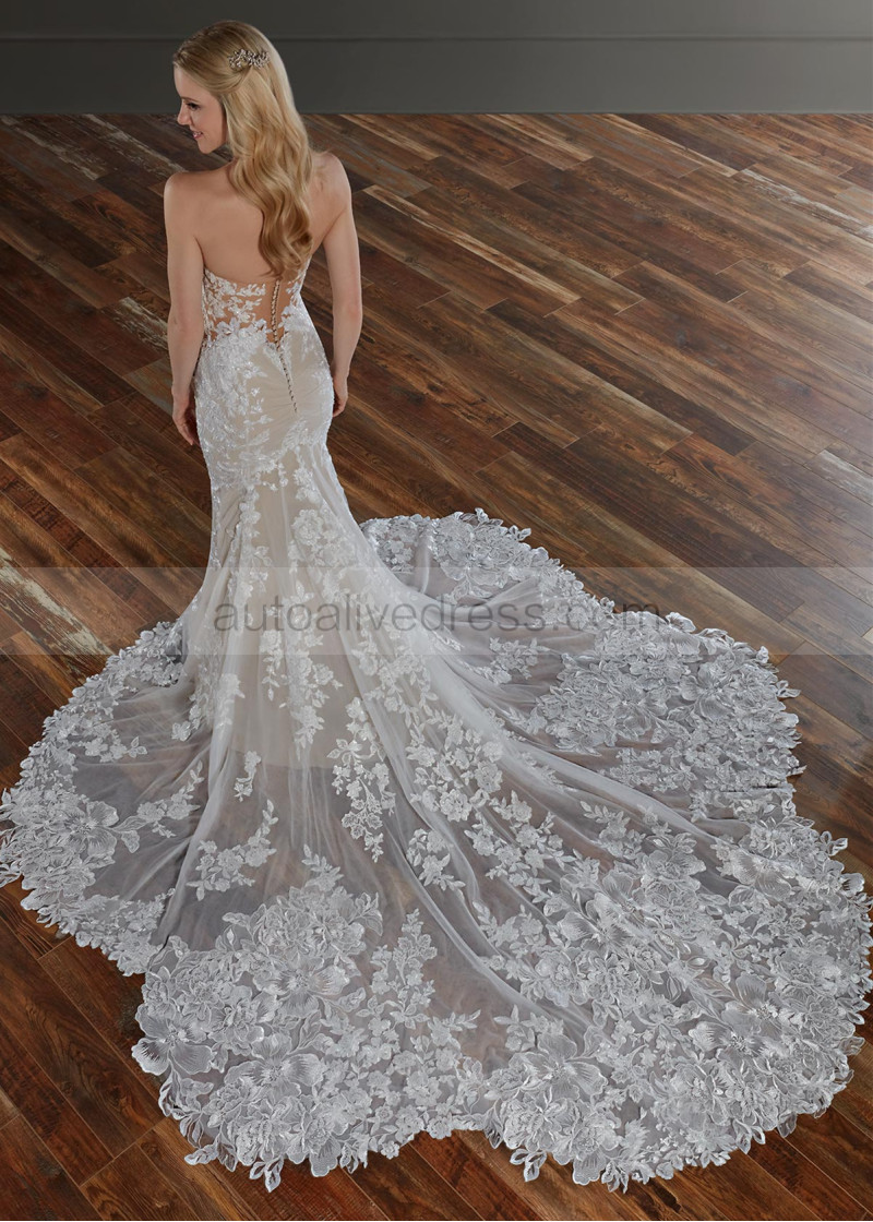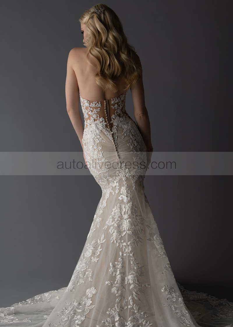 Strapless Plunging Neck Ivory Lace Tulle Open Buttons Back Wedding Dress