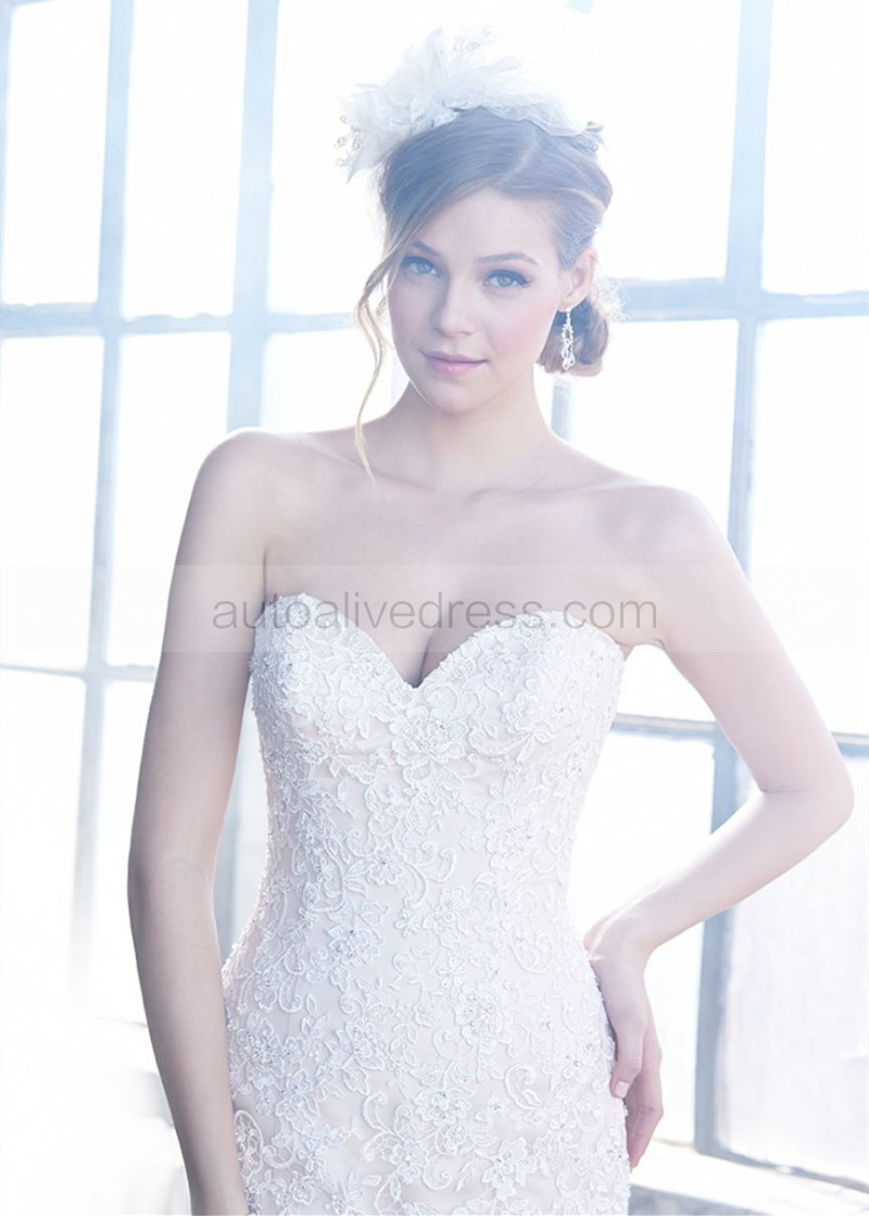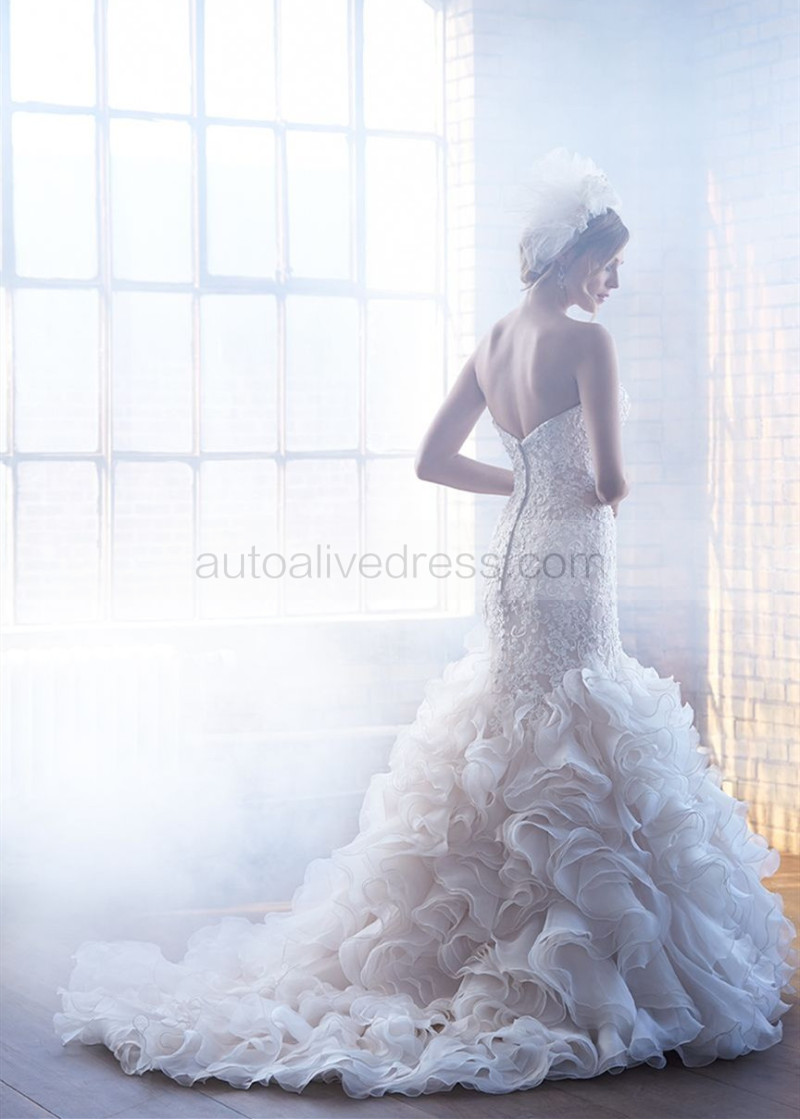 Strapless Sweetheart Beaded Ivory Lace Organza Ruffle Wedding Dress