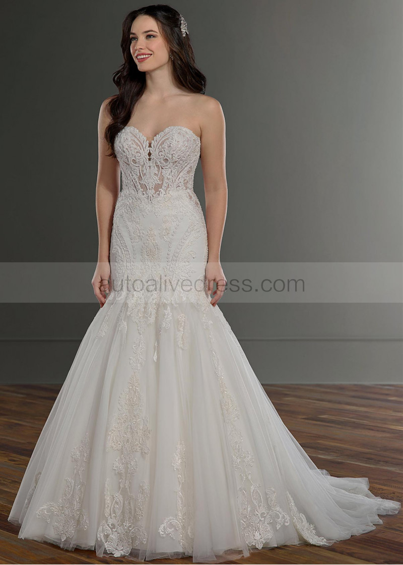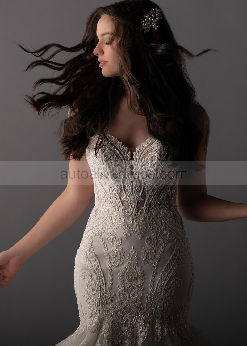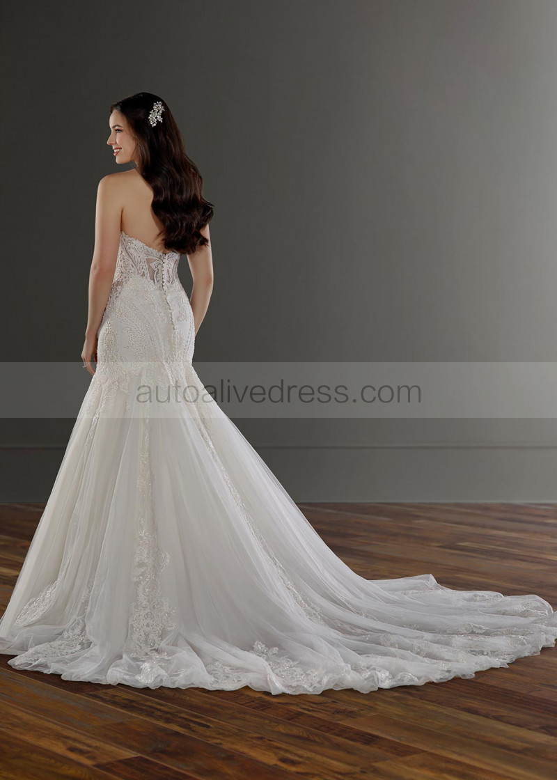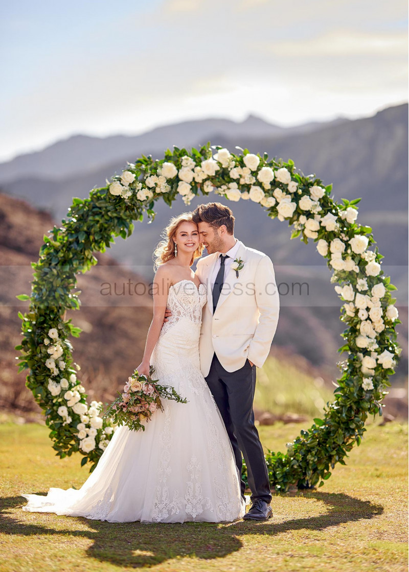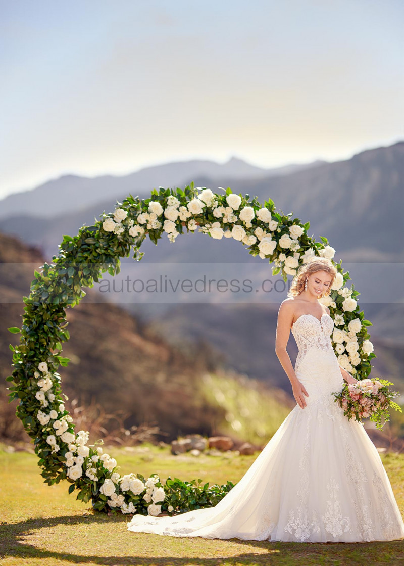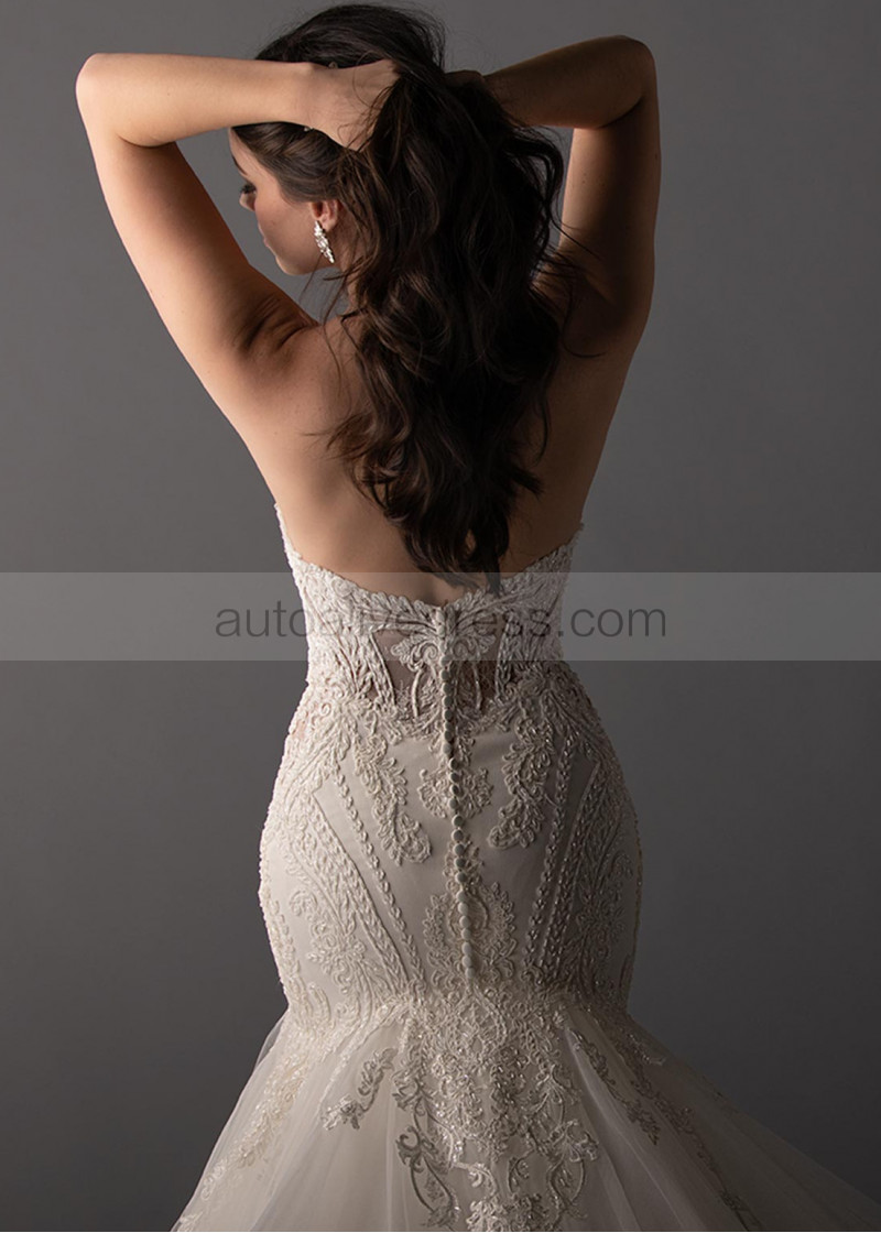 Strapless Sweetheart Neck Beaded Ivory Lace Tulle Buttons Back Wedding Dress