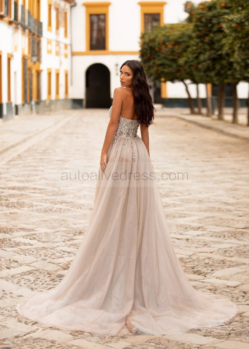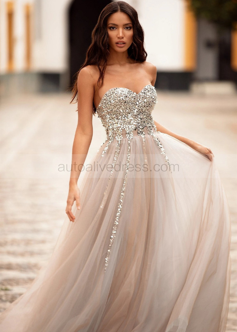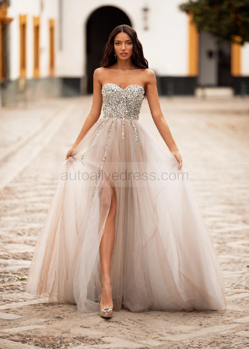 Strapless Sweetheart Neck Beaded Silver Tulle Slit Evening Dress
