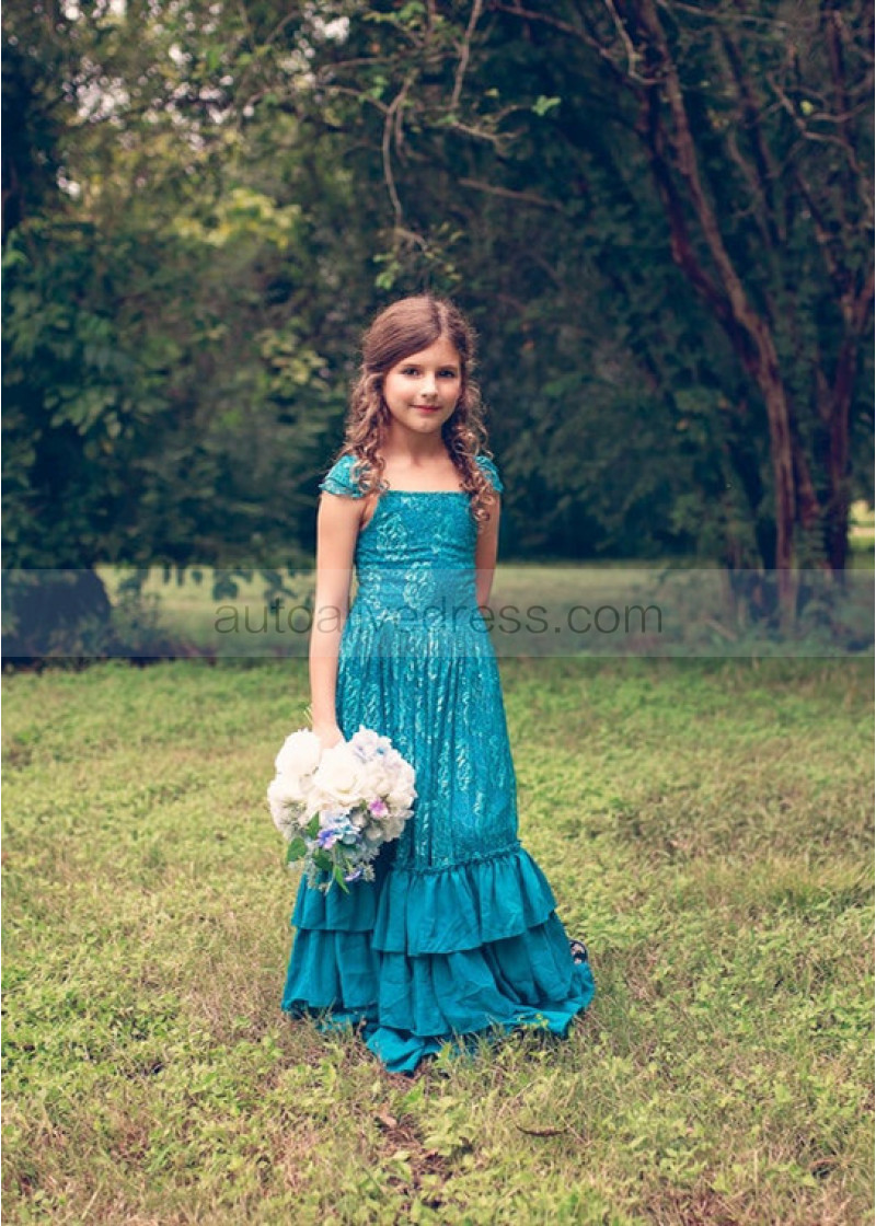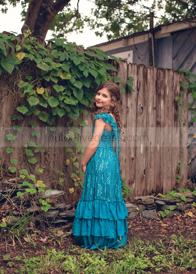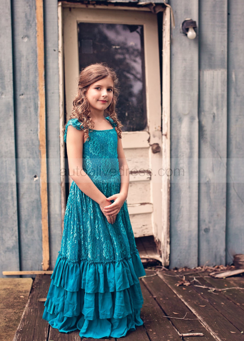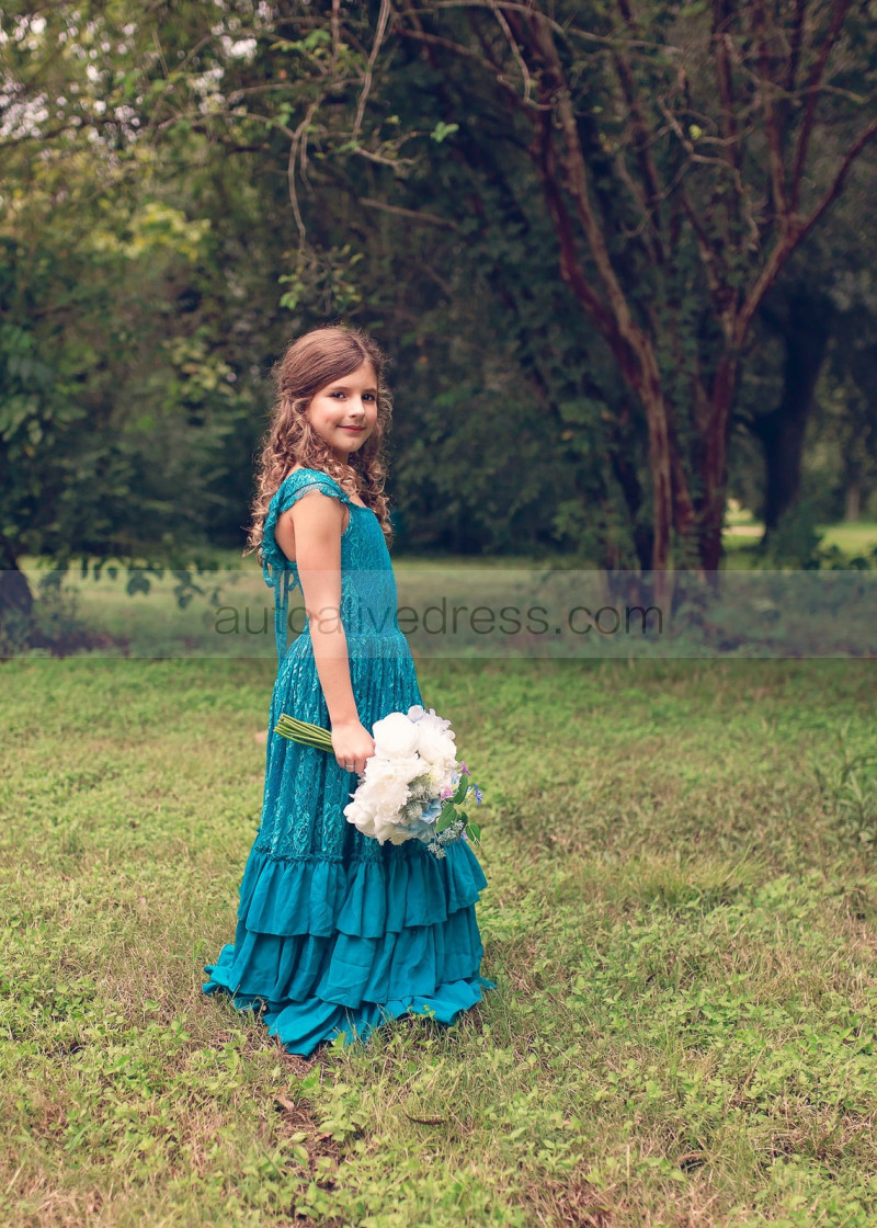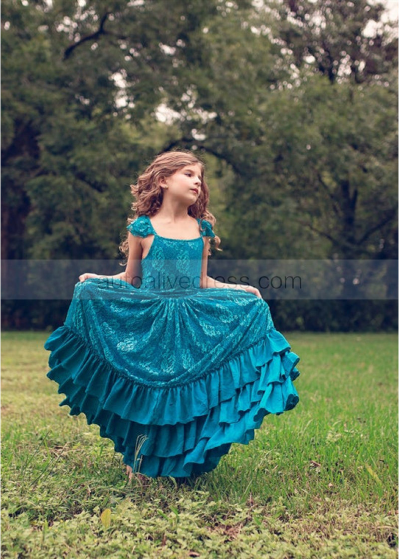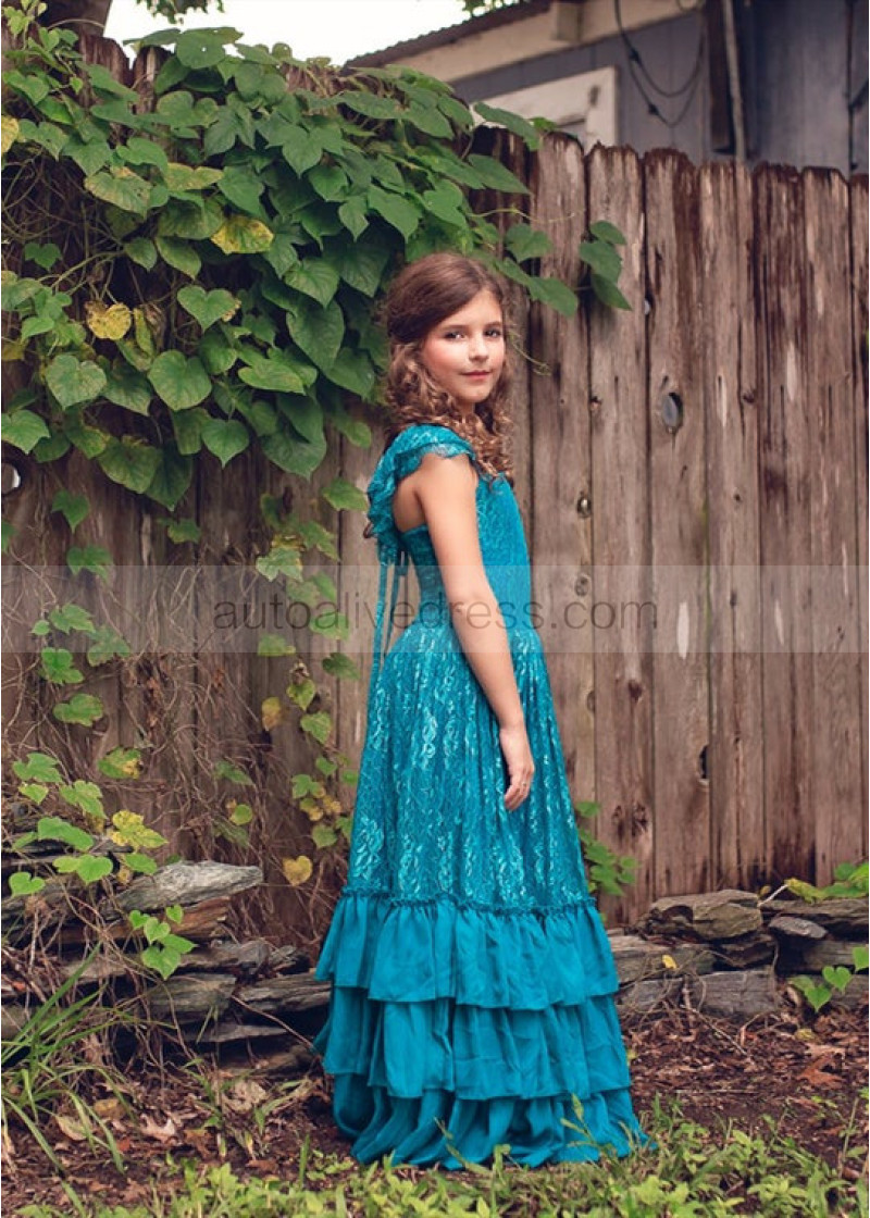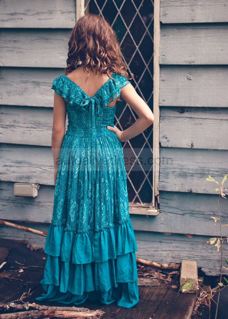 Teal Lace Chiffon V Back Bohemian Ruffle Flower Girl Dress